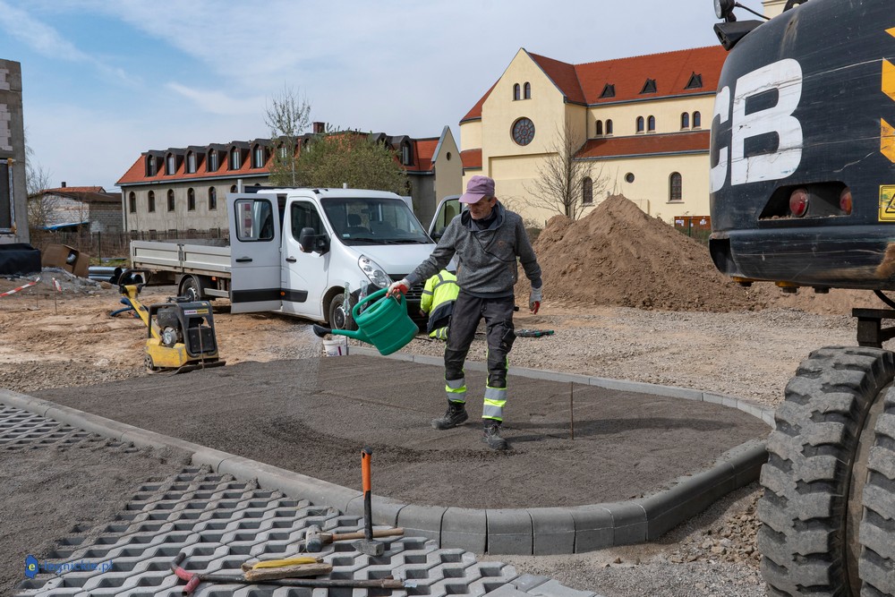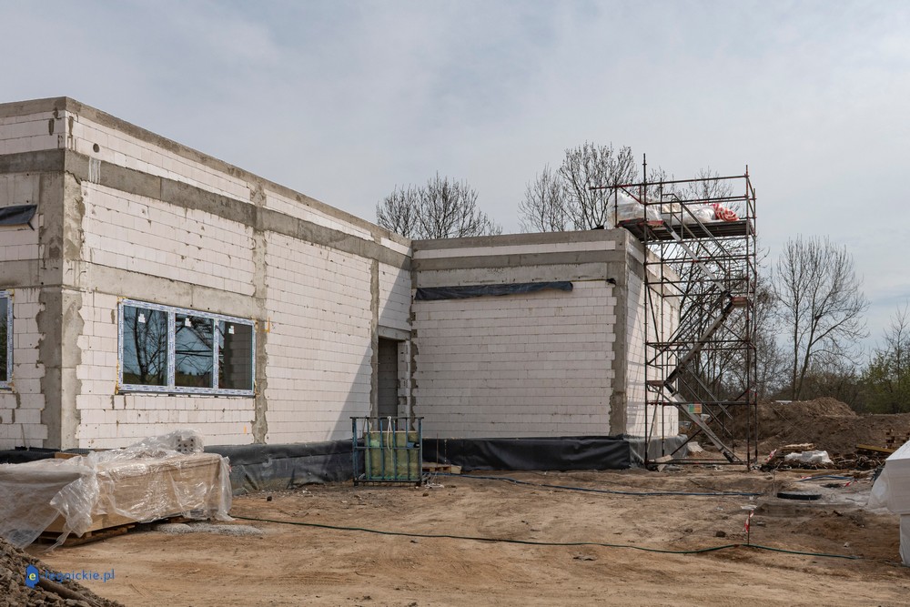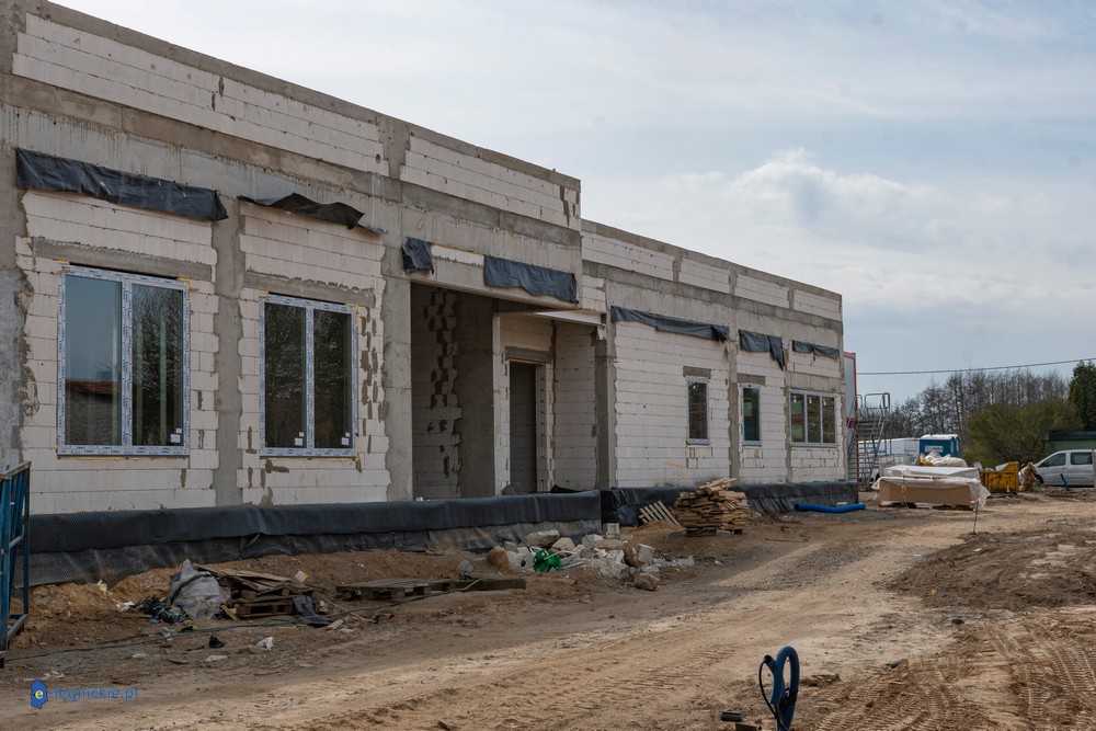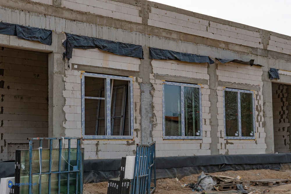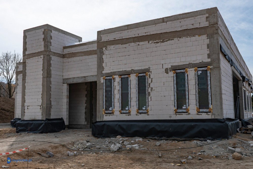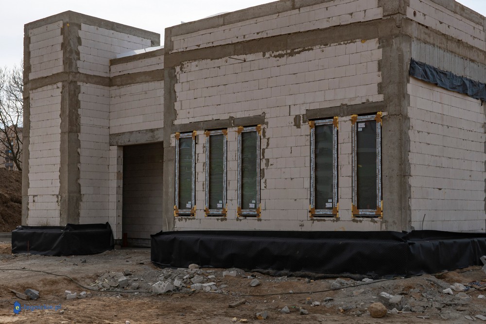 Obiekt osiągnął tzw. stan surowy zamknięty – wykonano konstrukcję ścian i dachu oraz zamontowano stolarkę okienną. Parterowy budynek ma już docelowy kształt, co pozwala na prowadzenie dalszych prac wewnętrznych. Równolegle trwają roboty na zewnątrz – przed obiektem kończy się układanie kostki brukowej na przyszłym parkingu dla użytkowników żłobka.