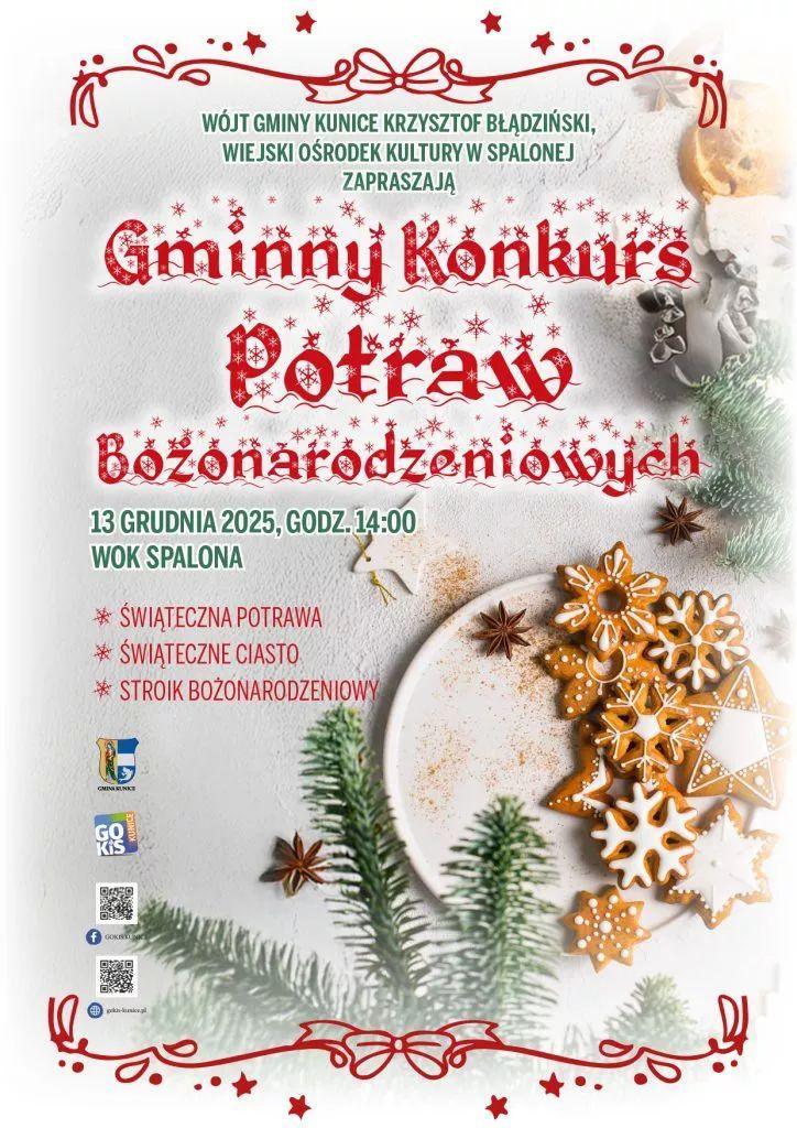 KUNICE. Wiejski Ośrodek Kultury w Spalonej tuż przed Świętami Bożego Narodzenia pachnie przyprawami do piernika, skórką pomarańczy i wieloma zapachami, które kojarzą się tylko z tym magicznym miesiącem w roku. 13 grudnia 2025 o godzinie 14:00 odbędzie się w tym miejscu Konkurs Potraw Bożonarodzeniowych.