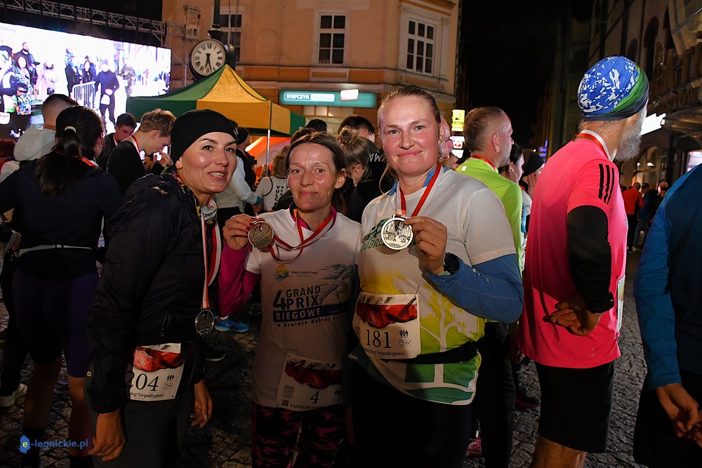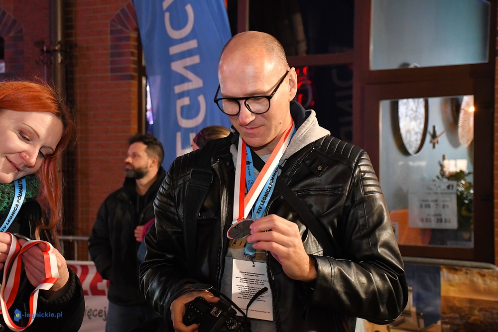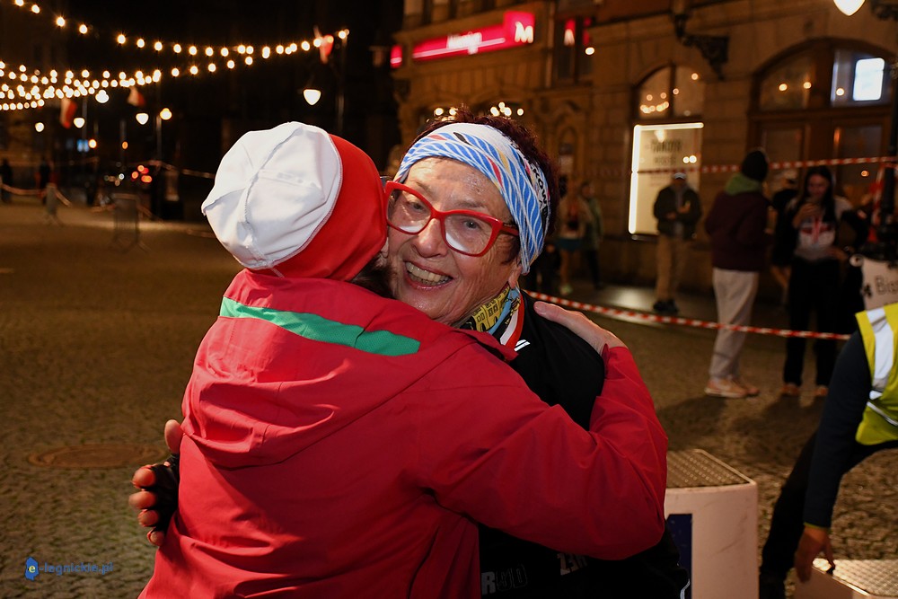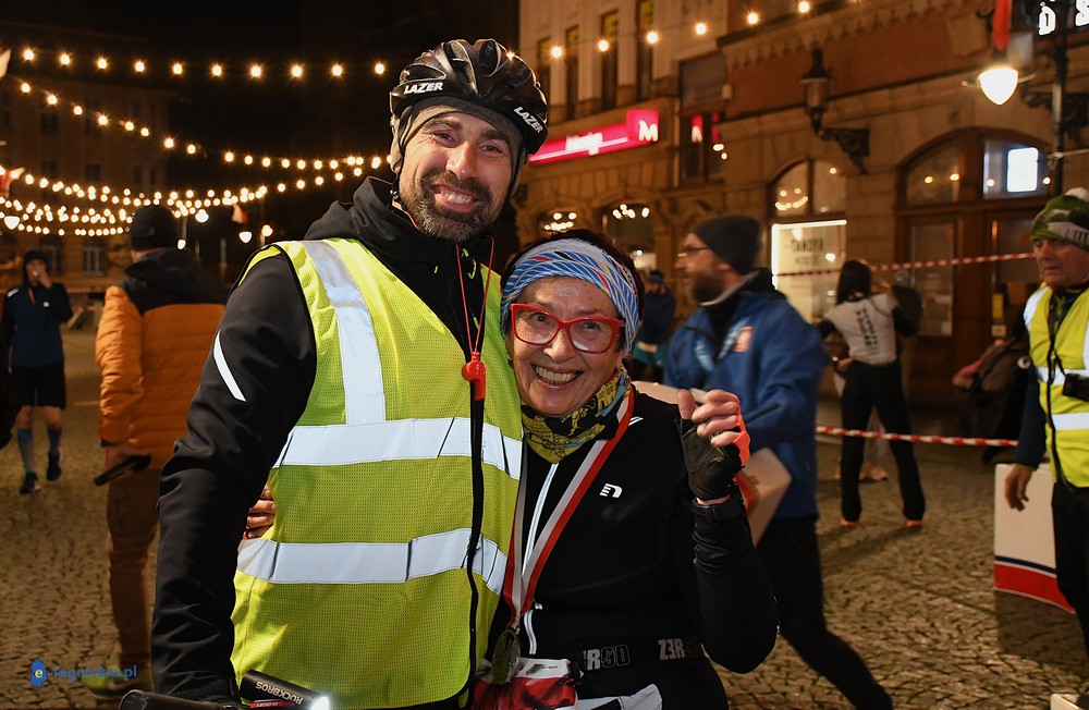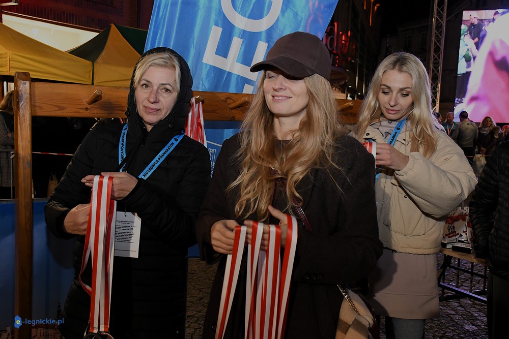 Na mecie medale biegaczom wręczali prezydenci: Maciej KUPAJ i Jacek BASZCZYK w towarzystwie Karoliny JACZEWSKIEJ-SZYMKOWIAK, przewodniczącej Rady Miejskiej. Z prezydentem Legnicy Maciejem Kupajem chętnie pozowała do zdjęć najstarsza uczestniczka biegu - Nina ZACZYŃSKA z Lubina.