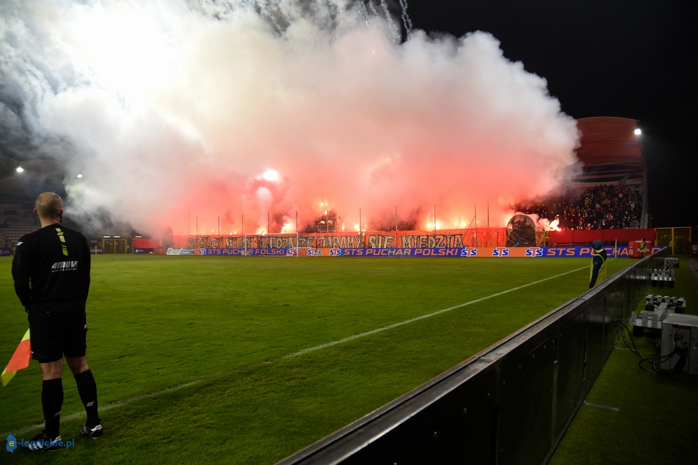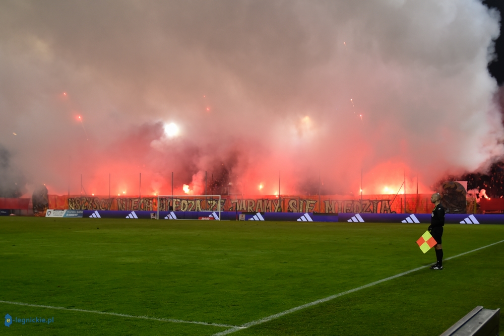 W pierwszej połowie fani Miedzi zaprezentowali pokaz pirotechniki zadymiając boisko. Przerwa trwała 8 minut, a na murawę spadło trochę pozostałości po racach. Już wszyscy wiedzą, że kibice z sektora C "jarają się Miedzią". Ale za "jaranie się" kary zapłaci niestety klub i oby nie skończyło się karą zamknięcia trybuny C...