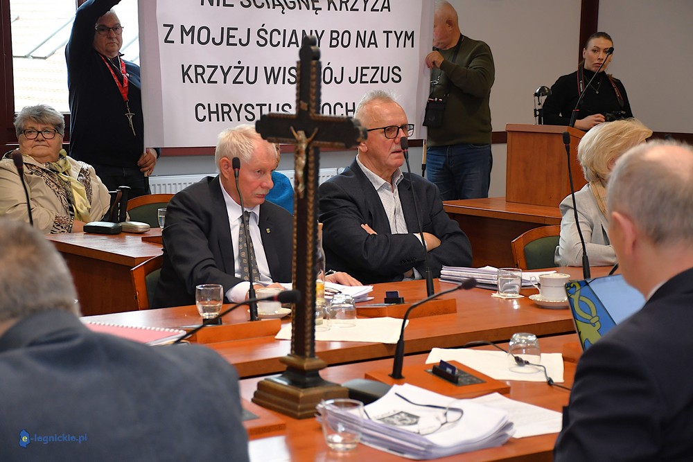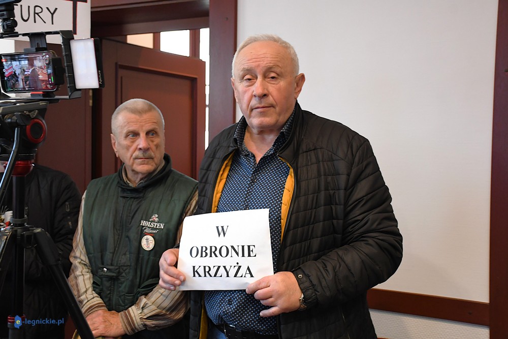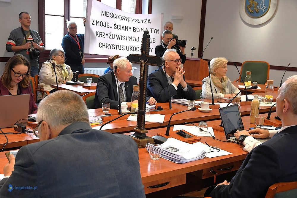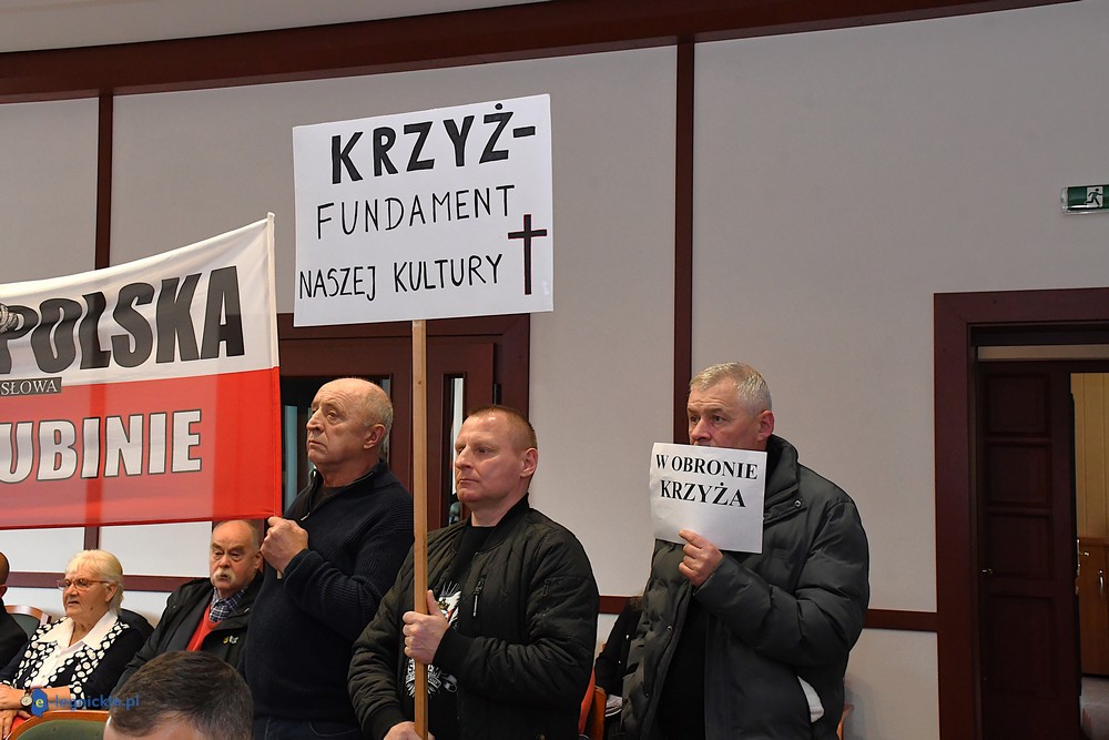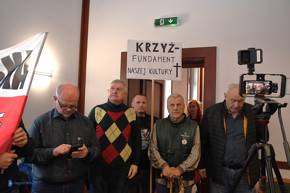 Na sesji radny Adam Wierzbicki (PiS) przyszedł z ogromnym krucyfiksem i ustawił go na stole prezydialnym. Zapowiedział, że będzie go przynosił na każdą sesję, co obrońcy krzyża powitali oklaskami. - To nasz protest przeciwko arbitralnej decyzji prezydenta Macieja Kupaja, który usunął z sali obrad krzyż powieszony tam przed ponad 20 laty.