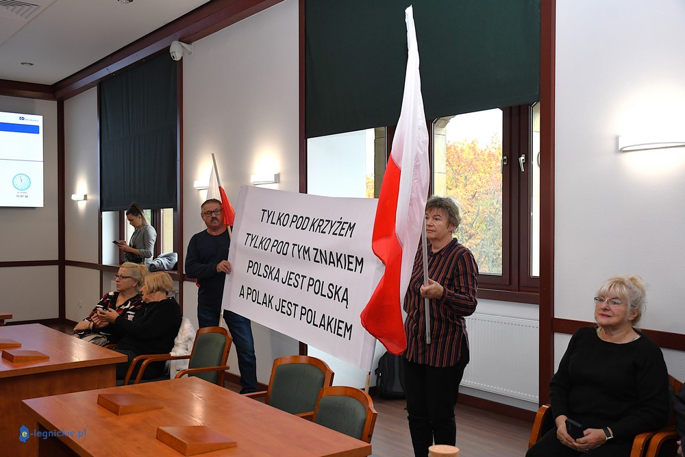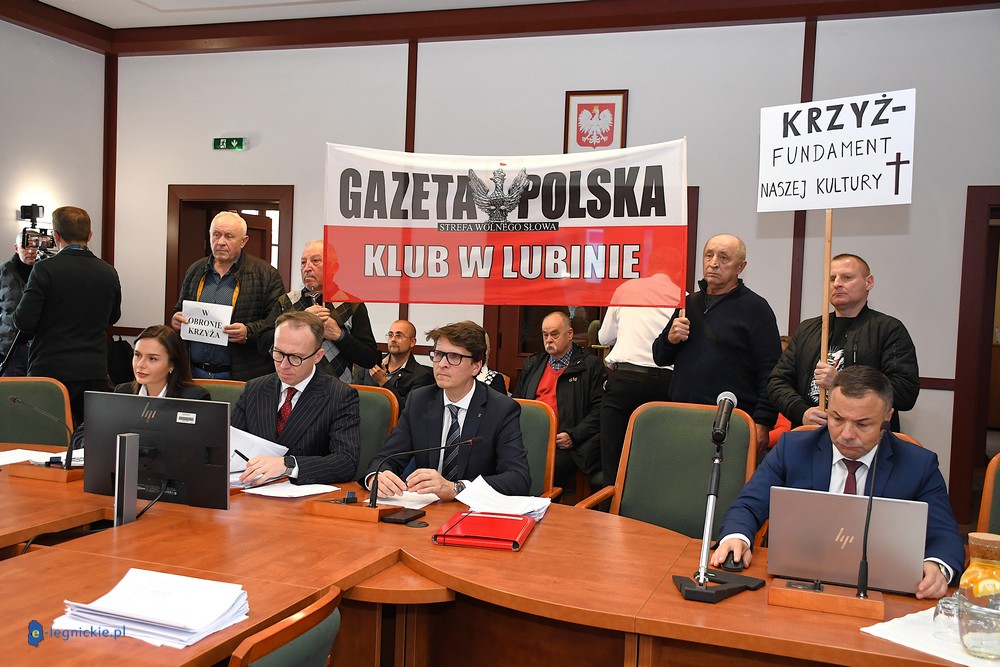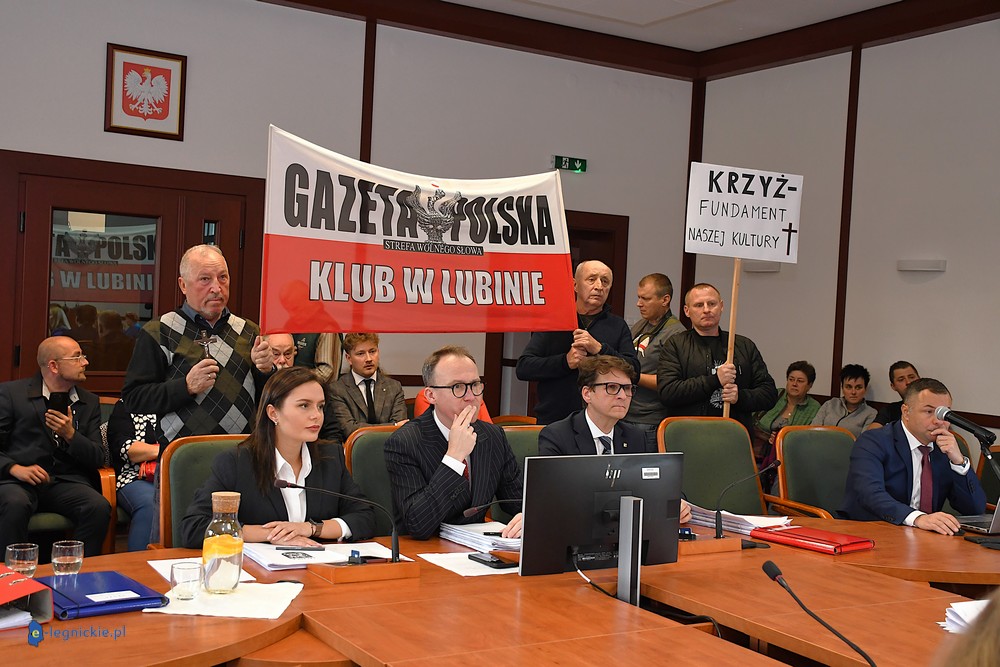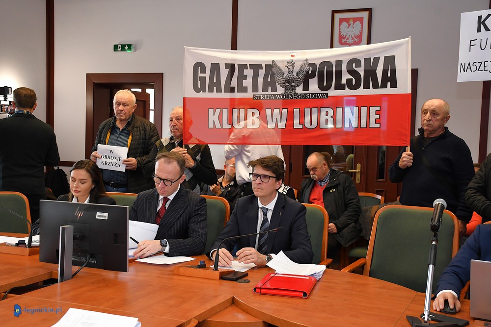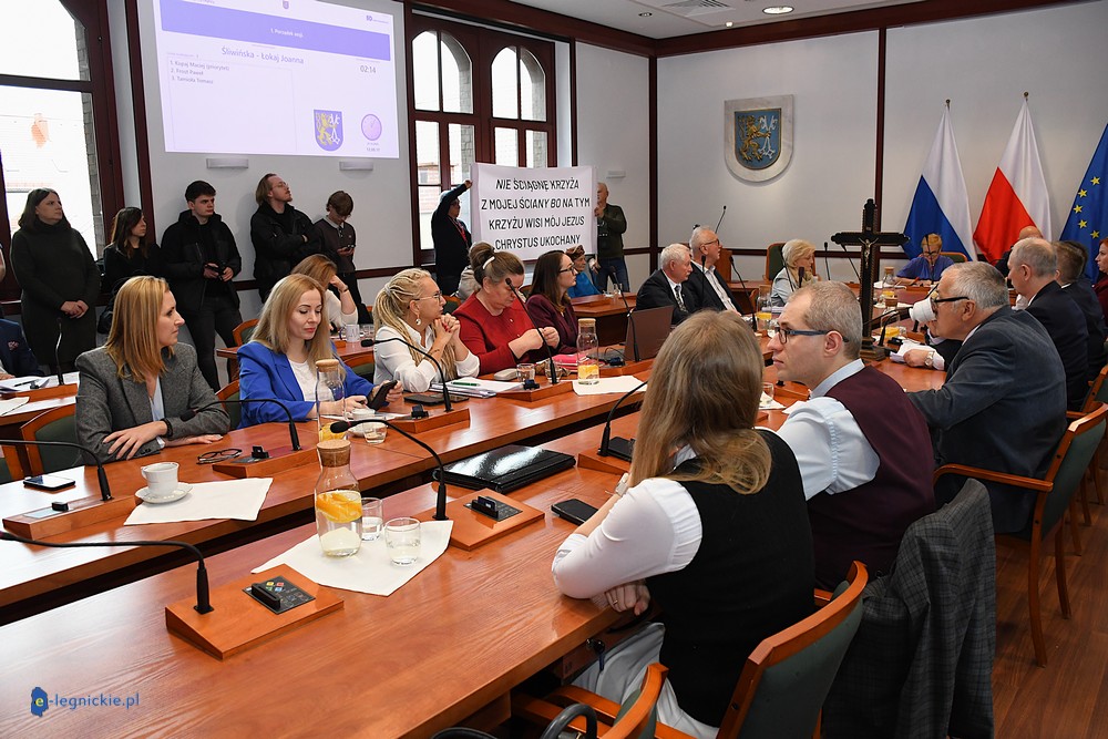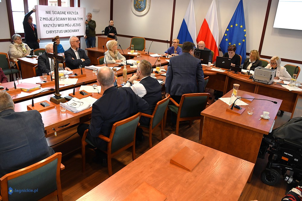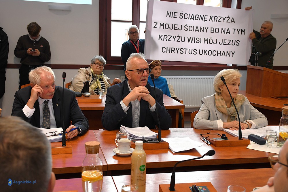 LEGNICA. "Hańba!", "Gdzie jest krzyż?!", "Wróciła Mała Moskwa", "Jesteście gorsi od komunistów!"- grzmieli mieszkańcy na sesji rady miejskiej Legnicy. Kilkadziesiąt osób pojawiło się dziś na sali obrad, by stanąć w obronie krzyża, który zniknął z sali latem tego roku. Przez około dwie godziny trwały przepychanki pomiędzy Prawem i Sprawiedliwością, a większością rady w sprawie dopuszczenia ich do głosu. Dla uspokojenia nastrojów prowadzący obrady wiceprzewodniczący Tomasz Tamioła kilkukrotnie ogłaszał przerwę, a samo ustalenie porządku obrad zajęło dwie godziny.
