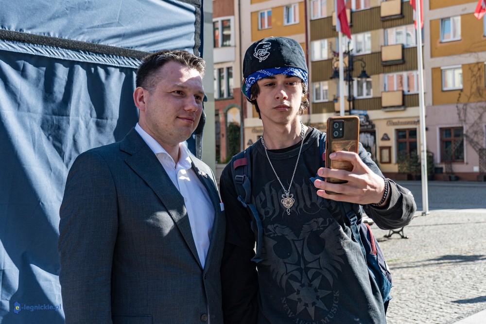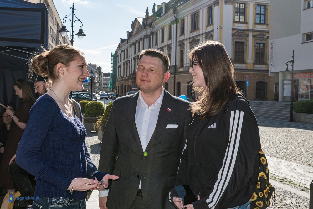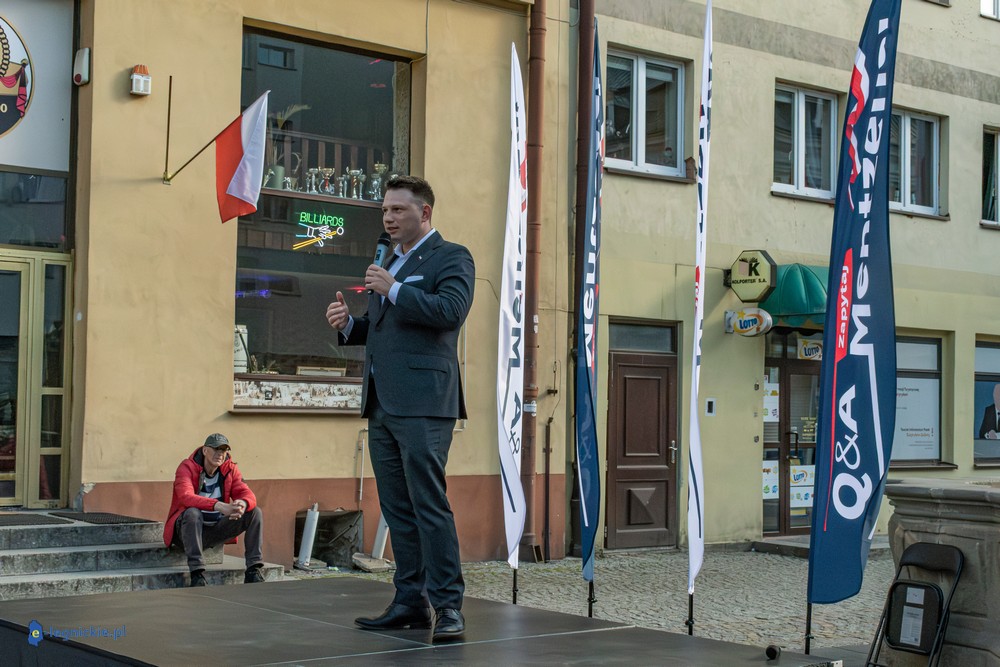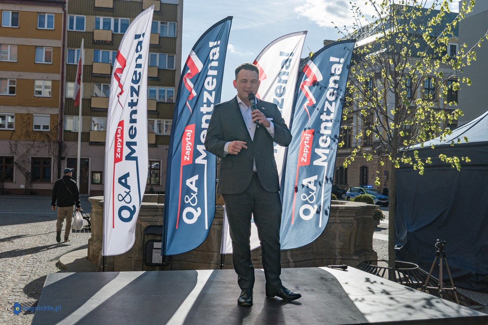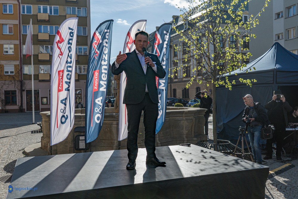LEGNICA. Około 150 osób przyszło w środowe popołudnie na Rynek, by spotkać się z Sławomirem Mentzenem, liderem partii "Nowa Nadzieja". Otwarte spotkanie w formule Q&A rozpoczęło się o godz. 17:00 i od początku było dynamiczne – pytania sypały się jedno po drugim. Organizatorzy zadbali też o uczestników – przed wydarzeniem i w jego trakcie serwowano gorącą grochówkę.