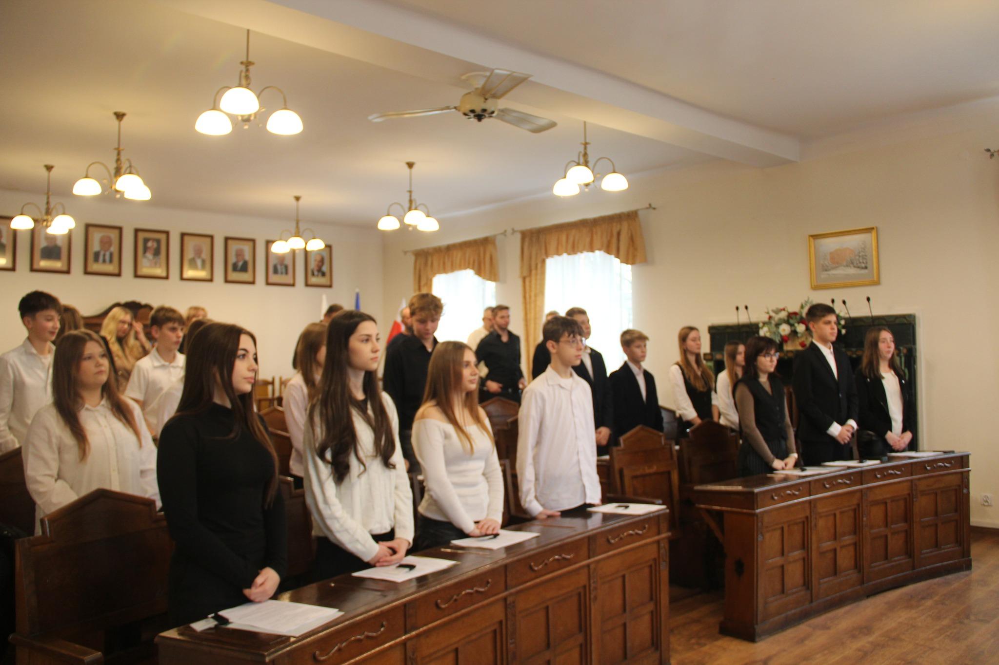 CHOJNÓW. 14 listopada w sali posiedzeń Urzędu Miejskiego odbyła się inauguracyjna sesja IX kadencji Młodzieżowej Rady Miejskiej w Chojnowie. Był to wyjątkowy i uroczysty moment dla wybranych w szkolnych wyborach radnych, którzy po zasiedli w ławach młodzieżowego samorządu, aby reprezentować rówieśników i wnieść swój głos w życie publiczne miasta. Sesję rozpoczęło oficjalne zaprzysiężenie radnych - symboliczny akt, który podkreślił wagę powierzonych im obowiązków. Każdy z młodych reprezentantów złożył ślubowanie, potwierdzając gotowość do działania na rzecz lokalnej społeczności. Następnie radni przystąpili do wyboru prezydium, które będzie odpowiadać za sprawną pracę rady i koordynowanie podejmowanych inicjatyw.