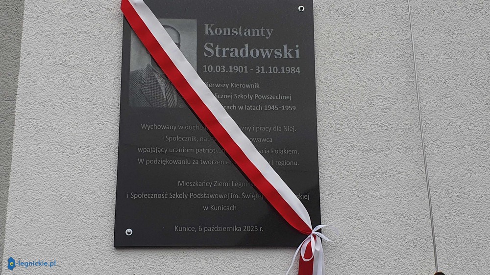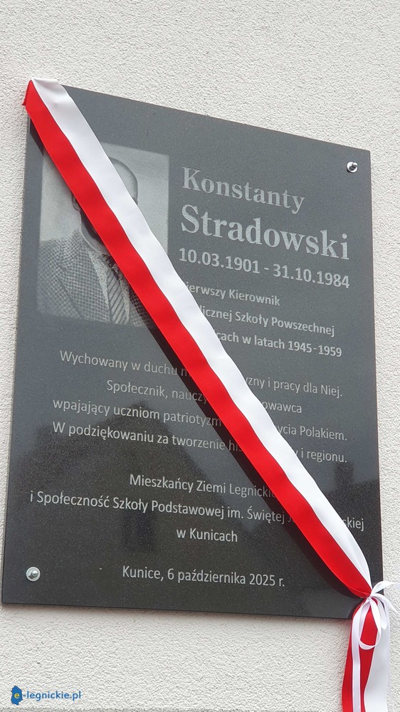KUNICE. Powojenny kurz jeszcze dobrze nie opadł, a już 1 września 1945 roku w szkole w Kunicach odbyły się pierwsze lekcje dla 29 uczniów zebranych w trzech klasach. Nowy rok szkolny ogłosił wówczas Konstanty Stradowski, przybyły z Kresów Wschodnich, który potrzebę edukacji stawiał na pierwszym miejscu. Dziś w Szkole Podstawowej w Kunicach odsłonięto tablicę poświęconą temu osadnikowi, który tworzył historię szkoły jako jej pierwszy kierownik.
