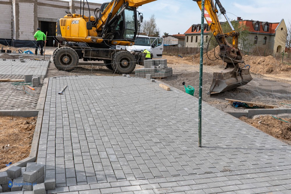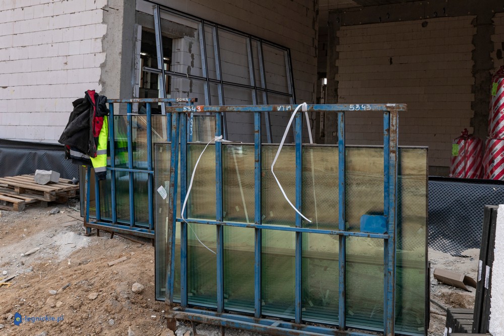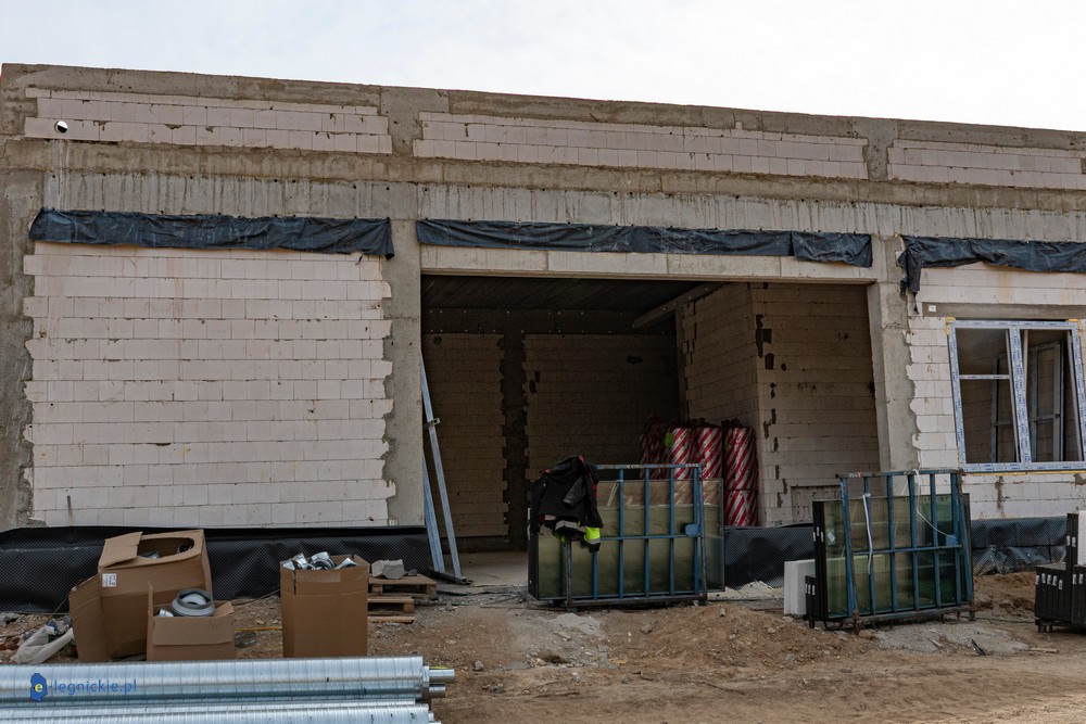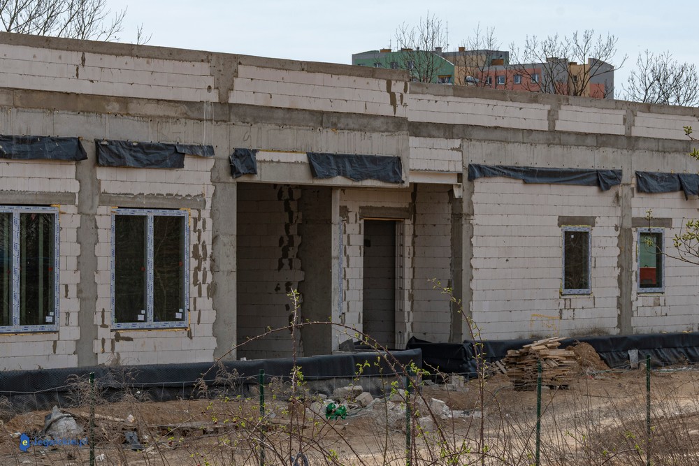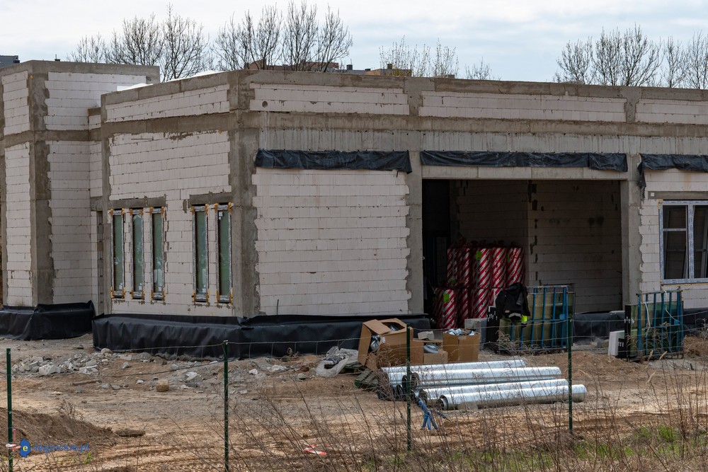 Obiekt osiągnął tzw. stan surowy zamknięty – wykonano konstrukcję ścian i dachu oraz zamontowano stolarkę okienną. Parterowy budynek ma już docelowy kształt, co pozwala na prowadzenie dalszych prac wewnętrznych. Równolegle trwają roboty na zewnątrz – przed obiektem kończy się układanie kostki brukowej na przyszłym parkingu dla użytkowników żłobka.