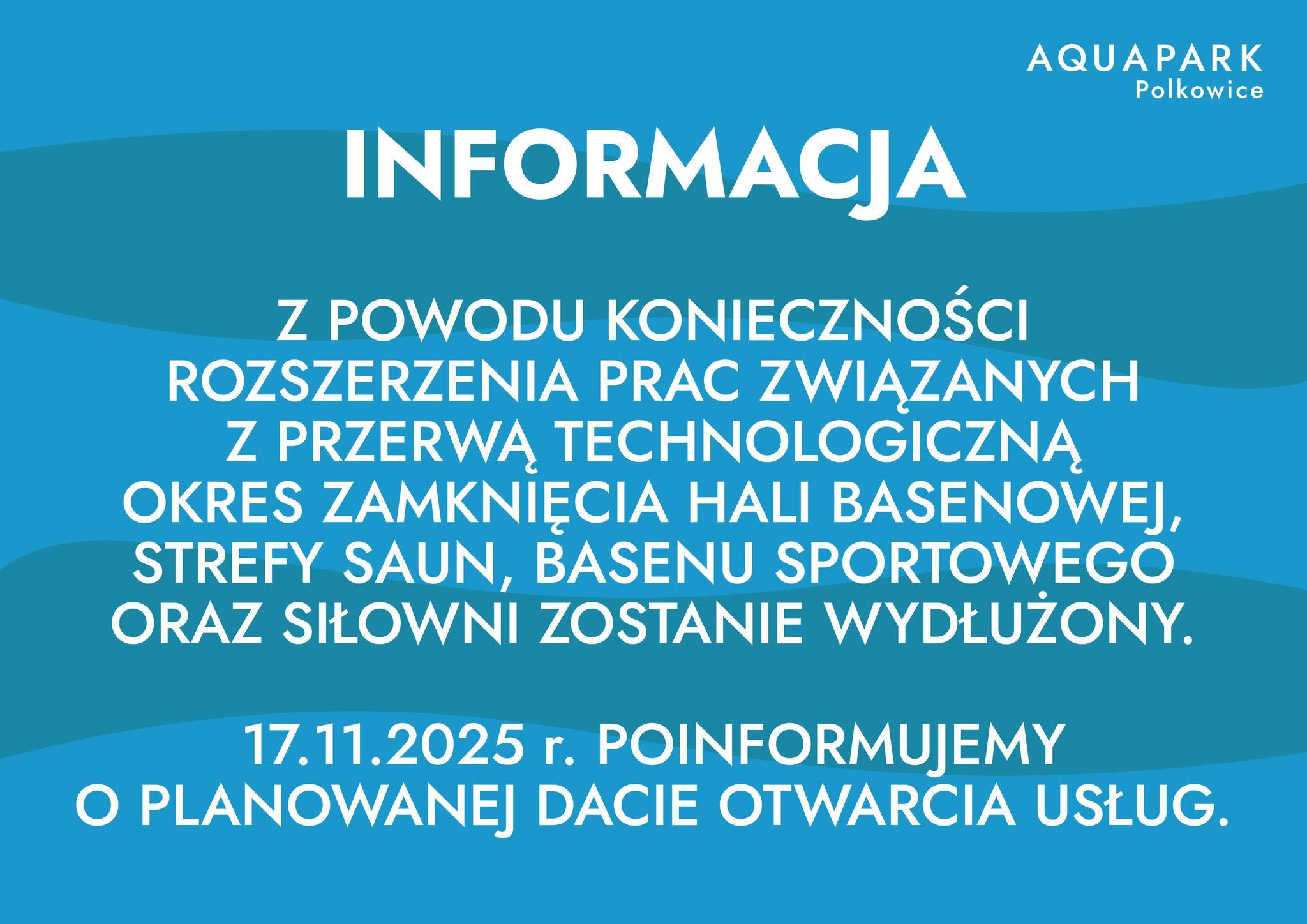 POLKOWICE. Hucznie otwarty w czerwcu 2025 roku Aquapark w Polkowicach po czterech miesiącach udaje się na zasłużony odpoczynek technologiczny. Jak informuje kierownictwo Aquaparku : " dniach 1–14 listopada 2025 roku w Aquapark Polkowice odbędzie się planowana przerwa technologiczna. W tym czasie niedostępne będą: hala basenowa, strefa saun, siłownia oraz basen sportowy. Nie będą się również odbywać zajęcia aqua aerobiku".