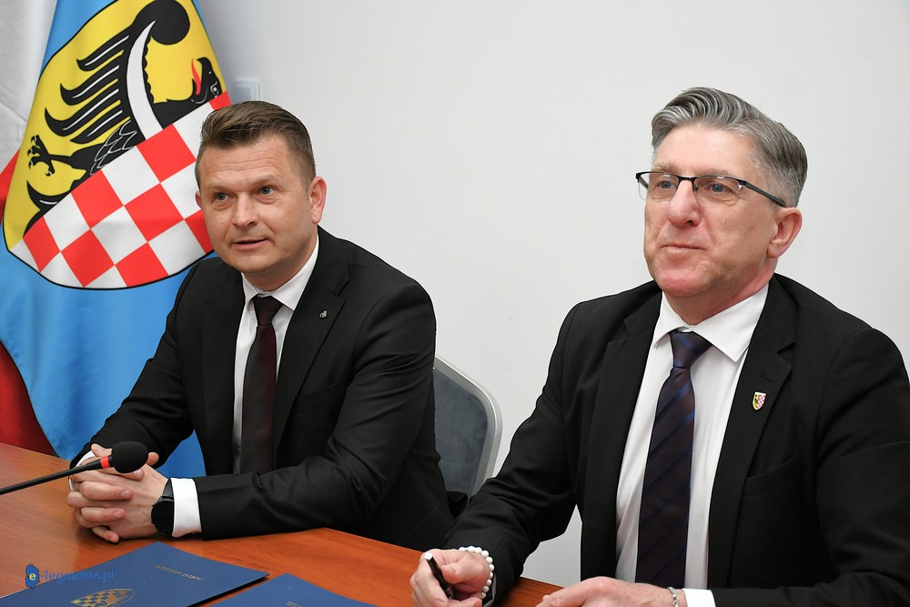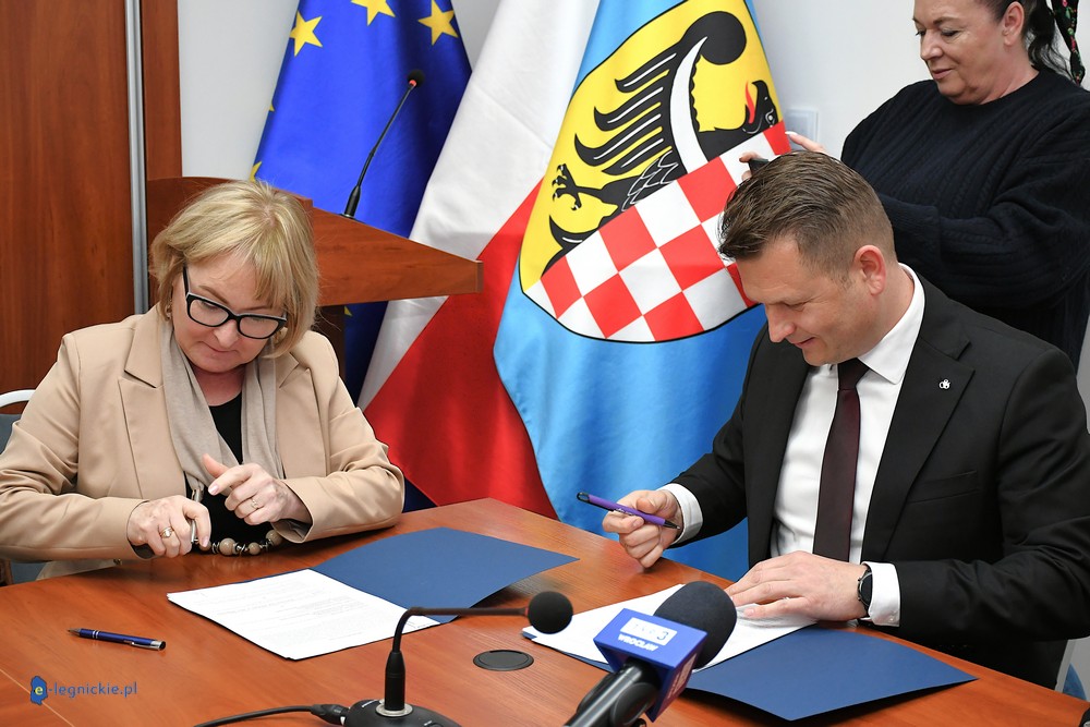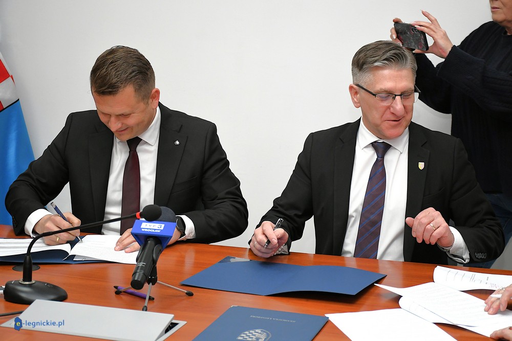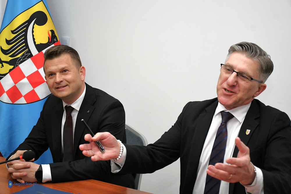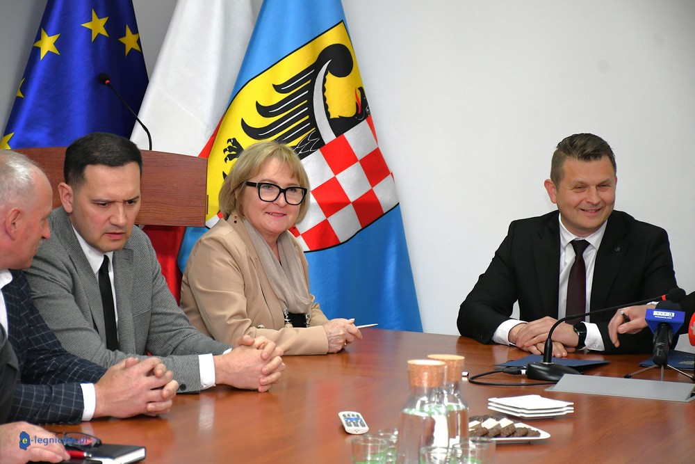 POWIAT LEGNICKI. W siedzibie Starostwa Powiatowego w Legnicy spotkali się liderzy Powiatów: Legnickiego - Adam BABUŚKA i Janina MAZUR oraz Złotoryjskiego - Rafał MIARA i Beata GRALAK, aby podpisać porozumienie dotyczące wspólnego przedsięwzięcia inwestycyjnego. Mowa o modernizacji, generalnym remoncie drogi, liczącej 1912 metrów, łączącej Gniewomierowice z Goślinowem. W spotkaniu wzięli udział także wójtowie gmin: Miłkowic- Dawid Stachura, wiejskiej Złotoryja -Jan Tymczyszyn oraz Zarządu Dróg Powiatowych z Wojciechem Cichoniem na czele, wykonawca inwestycji Mateusz Chamski z PTB Wrocław, radni oraz skarbniczki obu powiatów decydujące o finansach, także tych przeznaczanych na inwestycje: Marta PŁOSIŃSKA-SOBOŃ i Katarzyna LUDYNIA.