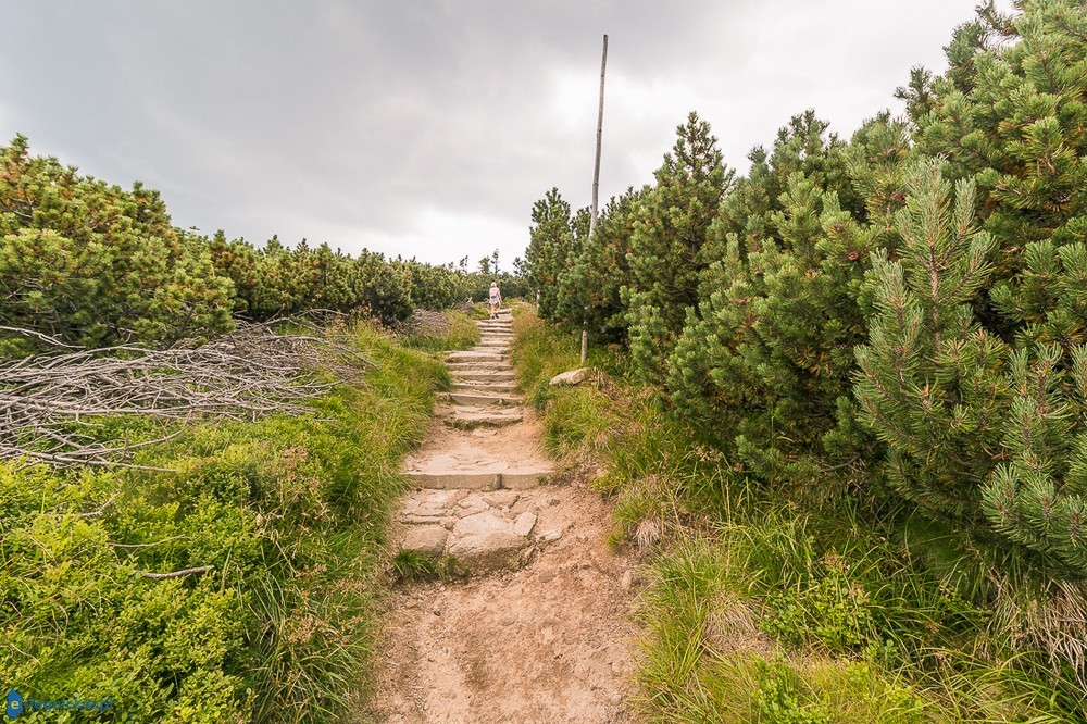 Wyruszamy z Karpacza. Auto zostawiamy na parkingu za Świątynią Wang. Cena 20 zł za cały dzień. Ruszamy w kierunku Wangu, za drogowskazami wskazującymi drogę do kościółka. Po kilkuset metrach docieramy do tarasu, skąd widać Świątynię w pełnej krasie, na tle Karkonoszy. Ruszamy dalej i po chwili docieramy do wejścia do Karkonoskiego Parku Narodowego. Kupujemy w kasie bilety ( 8 zł bilet normalny, 4 zł ulgowy ) i ruszamy do góry wzdłuż żółtego i niebieskiego szlaku. Po dwóch kilometrach docieramy do Polany . To węzeł szlaków i miejsce odpoczynku z kilkoma stołami i ławkami i bywa tu, zwłaszcza w weekendy, dosyć tłoczno.