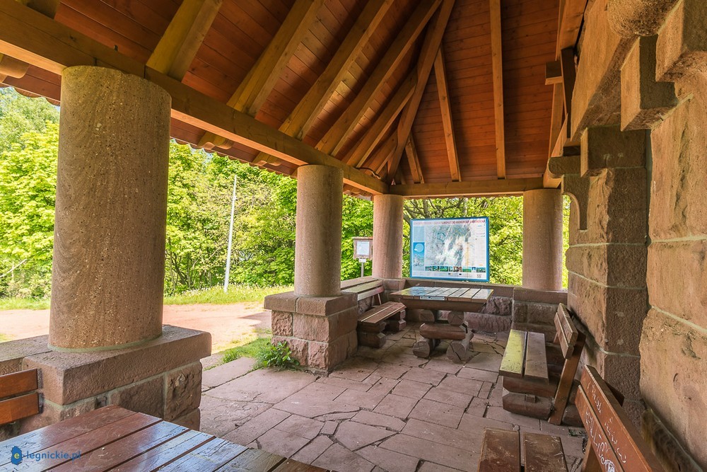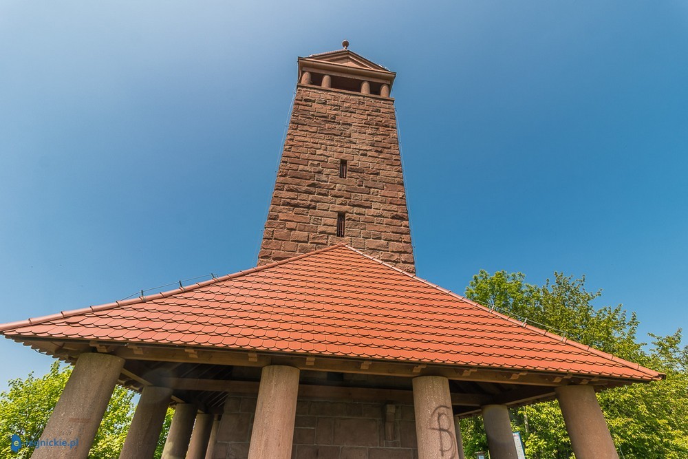 Wieża na Górze Świętej Anny zbudowana jest z miejscowego piaskowca o charakterystycznej, czerwonej barwie. Cała wieża ma niemal 23 metry wysokości, zaś platforma widokowa znajduje się na 17-stym metrze. Kanciasta, a u jej dołu znajduje się zadaszona wiata, wsparta na 14 kamiennych kolumnach - miejscu gdzie można przy drewnianych stołach usiąść na ławkach. Wcześniej wieża była o kilka metrów niższa, ale podczas remontu w 2014 roku podwyższono ten punk widokowy i dodatkowo przywrócono także jej dawny historyczny wygląd. W bezpośrednim sąsiedztwie tej wieży widokowej stoi kościołek pw. św. Anny 1644 roku, do którego warto zaglądnąć.