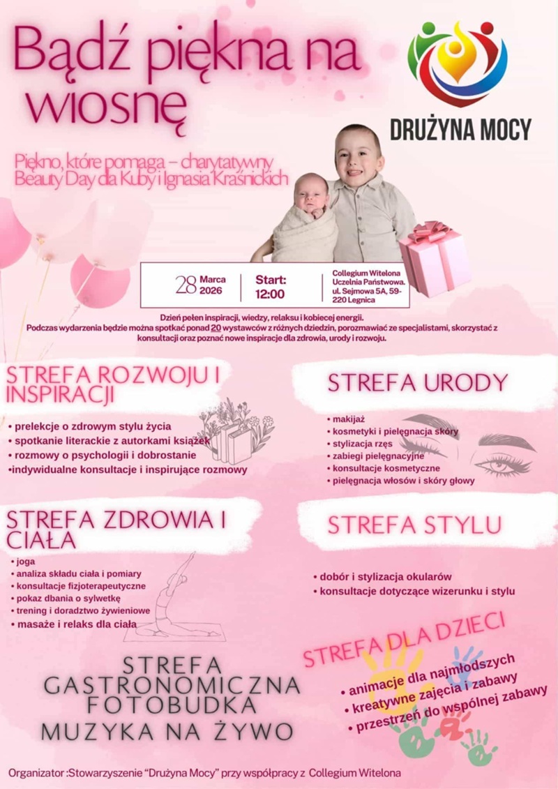 LEGNICA. Drogie Panie – chwila dla siebie i realna pomoc mogą iść w parze. Już 28 marca 2026 r. o godz. 12:00 w Collegium Witelona w Legnicy odbędzie się wydarzenie charytatywne „Bądź piękna na wiosnę”, organizowane przez Stowarzyszenie „Drużyna Mocy”. To propozycja dla kobiet, które chcą zadbać o urodę, zdrowie i dobre samopoczucie, a jednocześnie wesprzeć leczenie dwóch małych chłopców, braci – 10-letniego Kuby i 8-miesięcznego Ignasia.