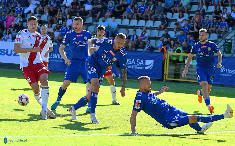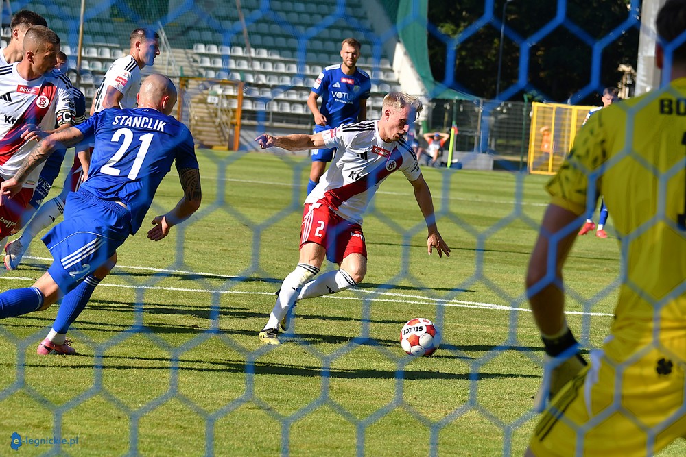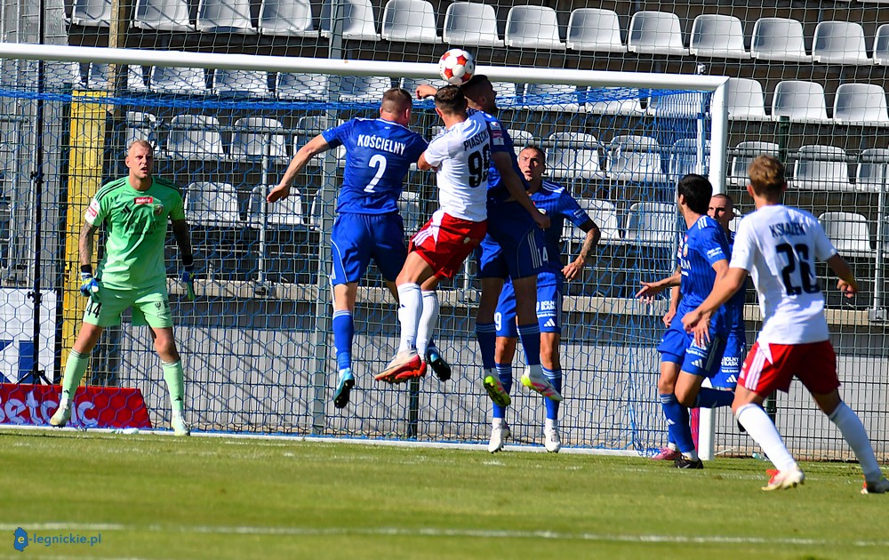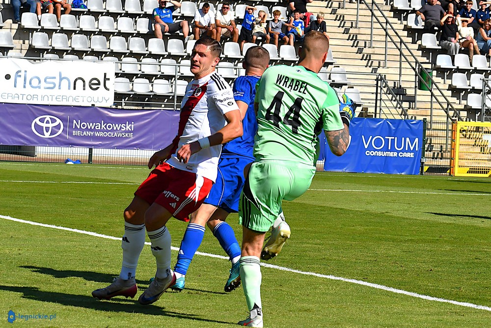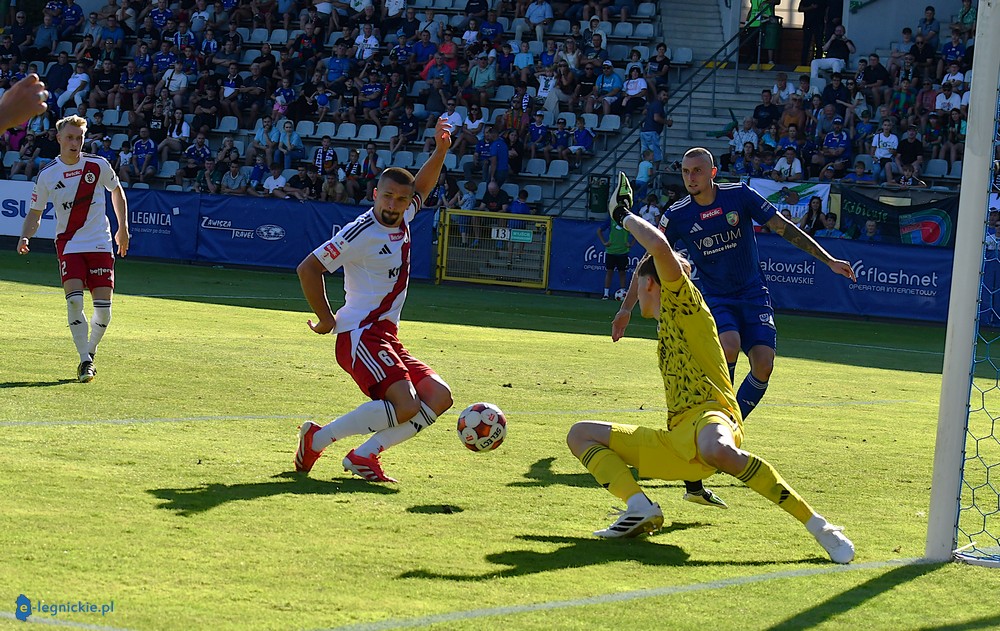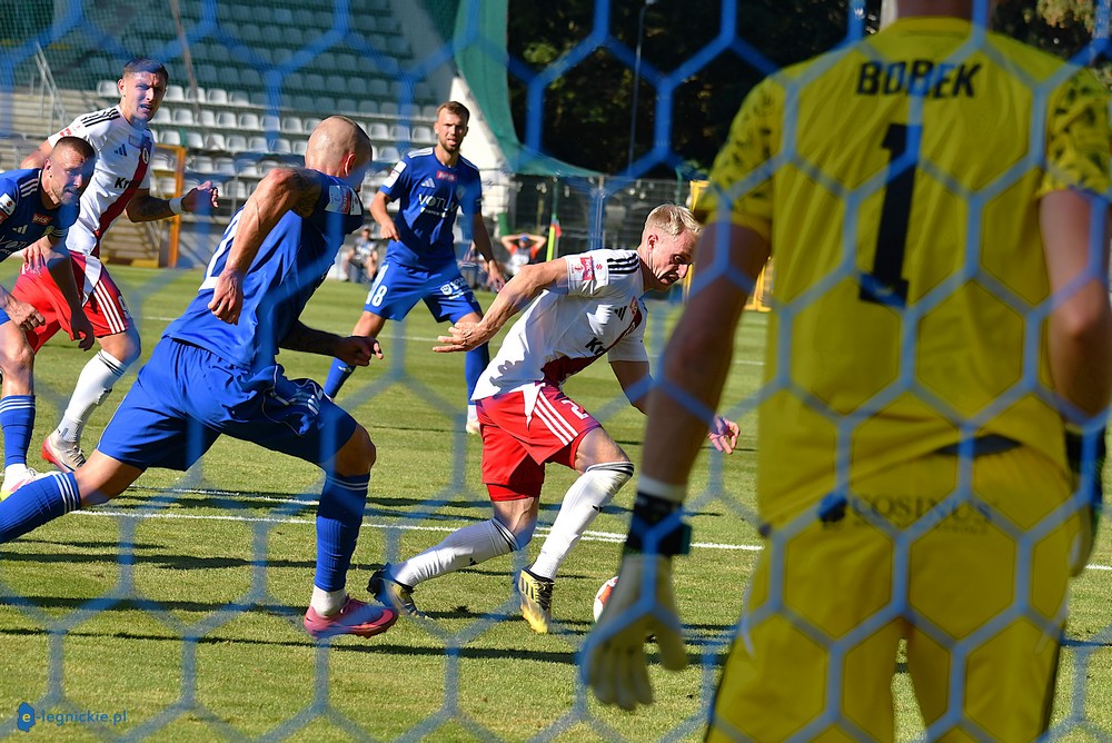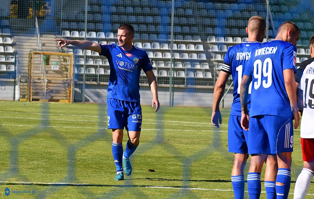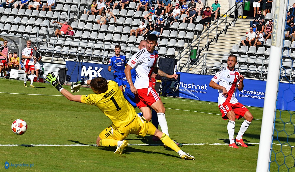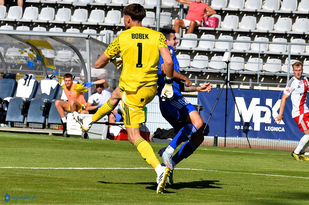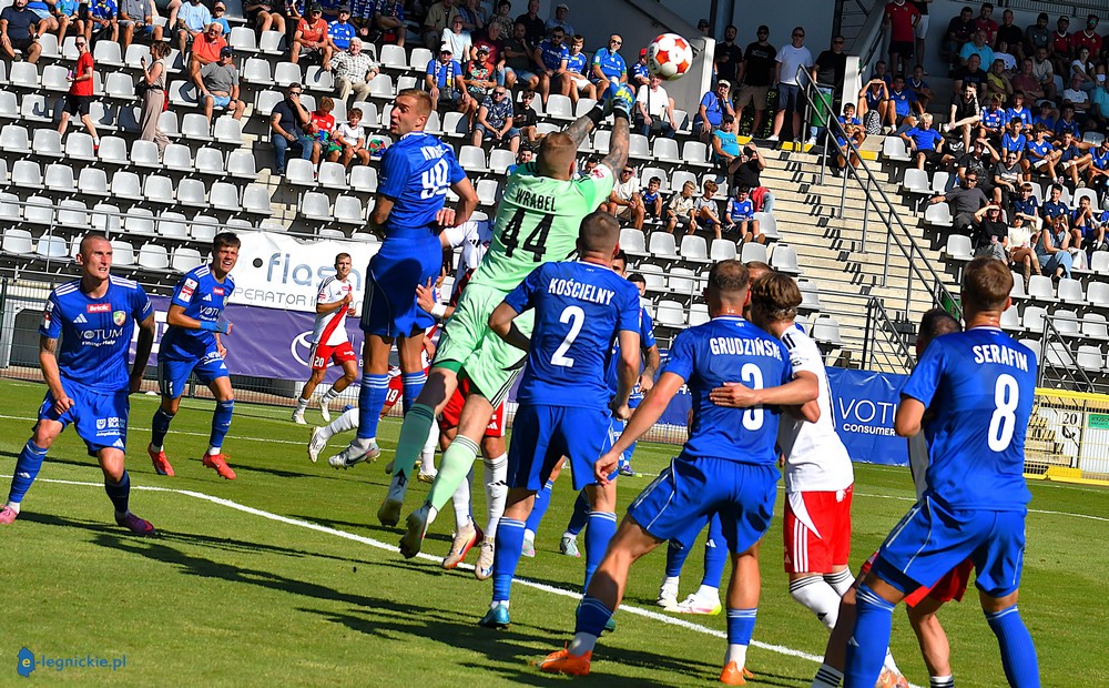Legniczanie mogli strzelić trzeciego gola, ale po uderzeniu z rzutu wolnego Jakuba Serafina piłka trafiła w poprzeczkę.