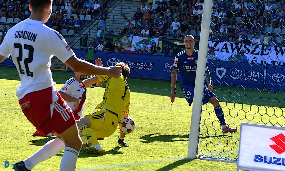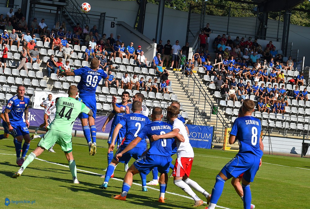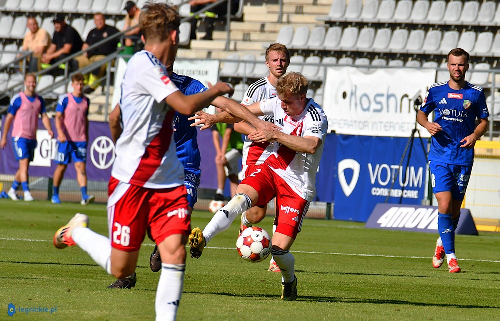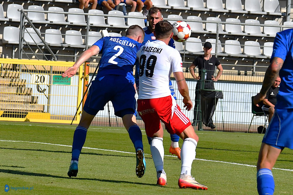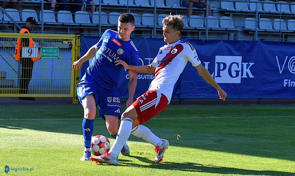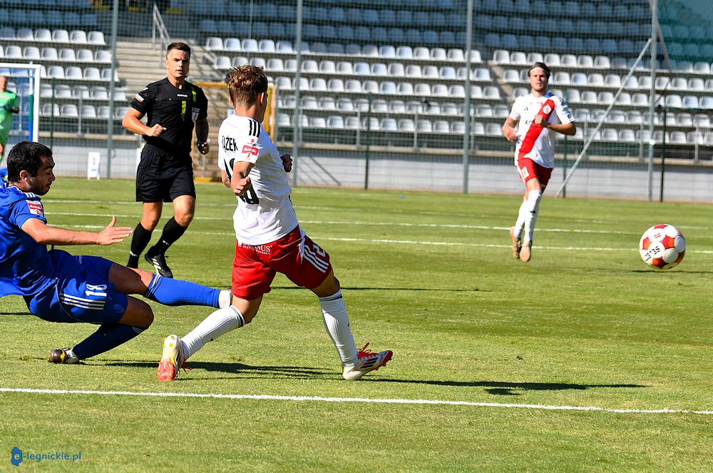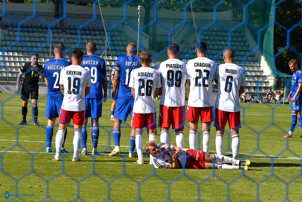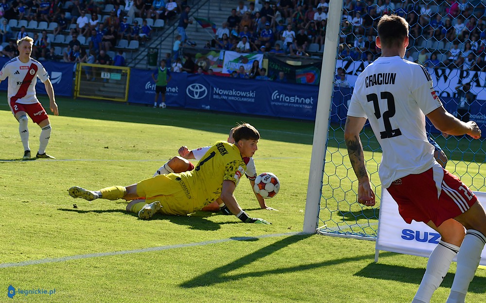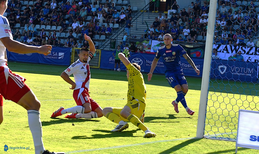 Legniczanie mogli strzelić trzeciego gola, ale po uderzeniu z rzutu wolnego Jakuba Serafina piłka trafiła w poprzeczkę.