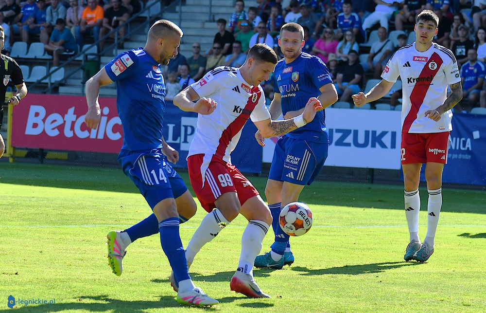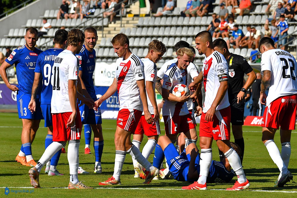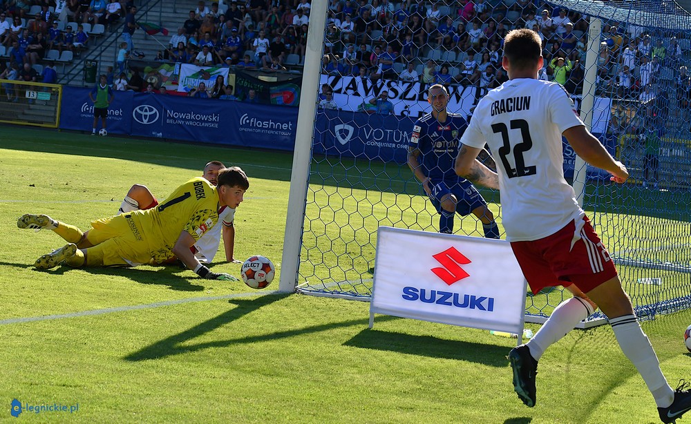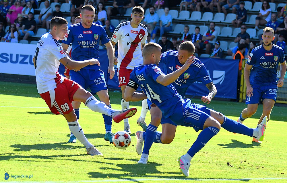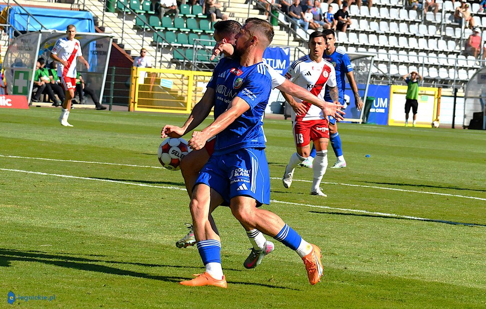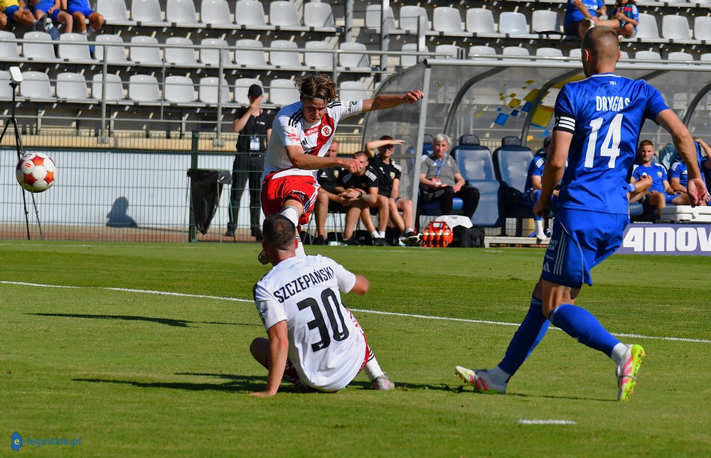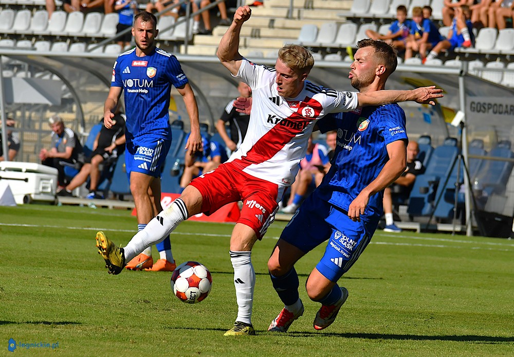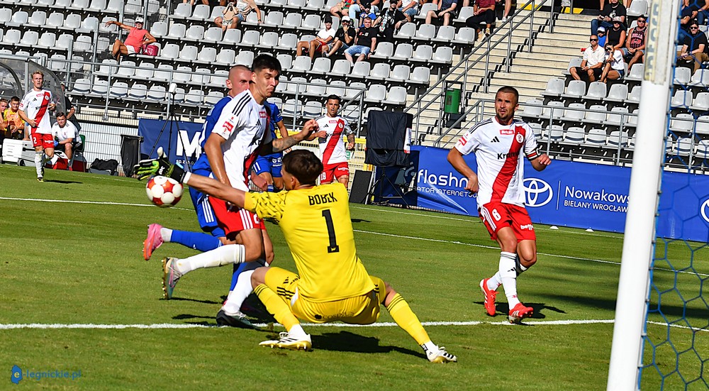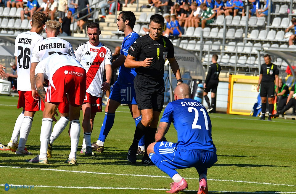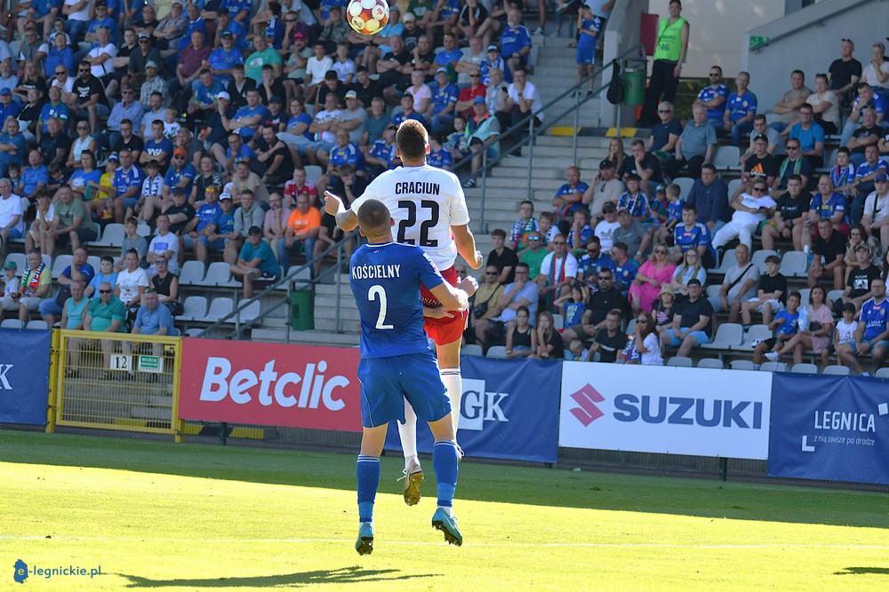 Legniczanie mogli strzelić trzeciego gola, ale po uderzeniu z rzutu wolnego Jakuba Serafina piłka trafiła w poprzeczkę.