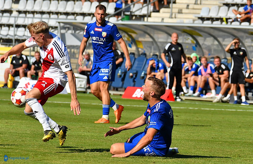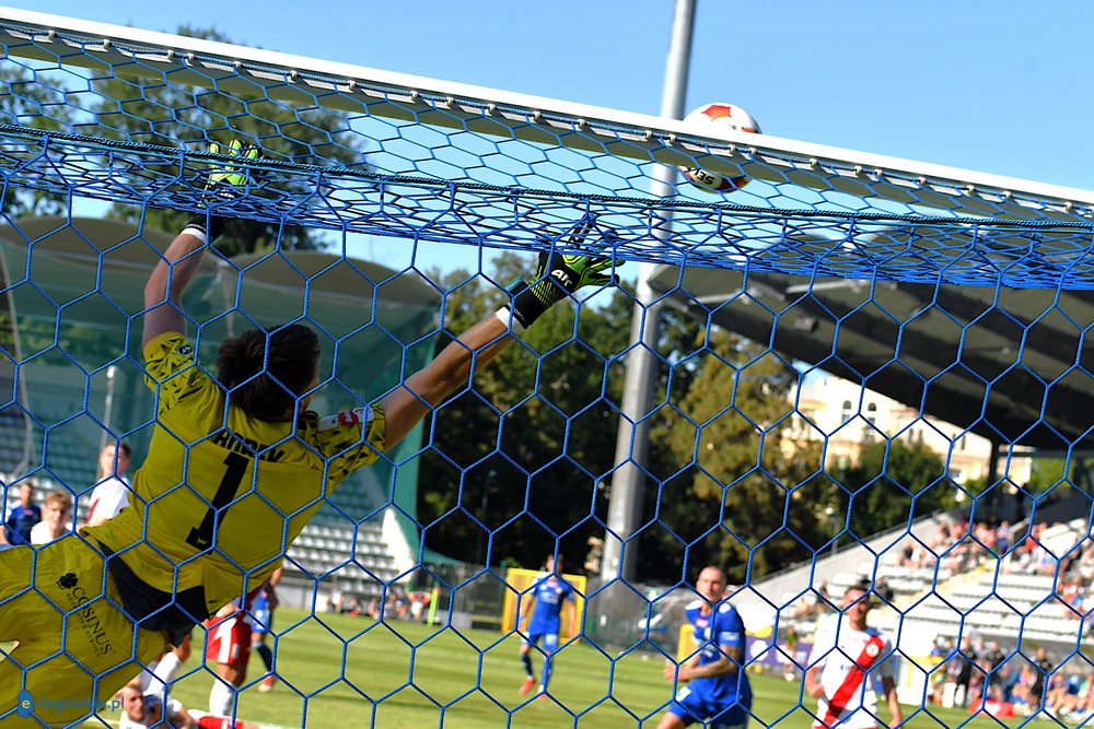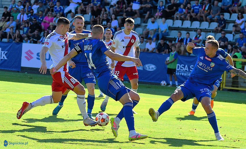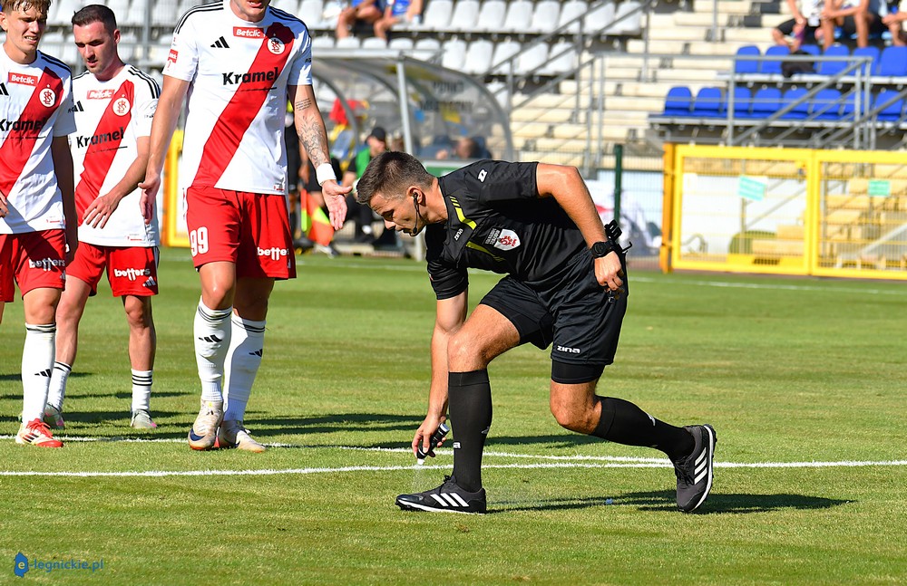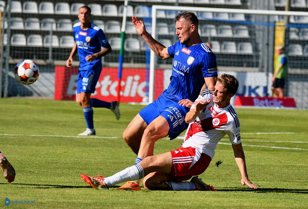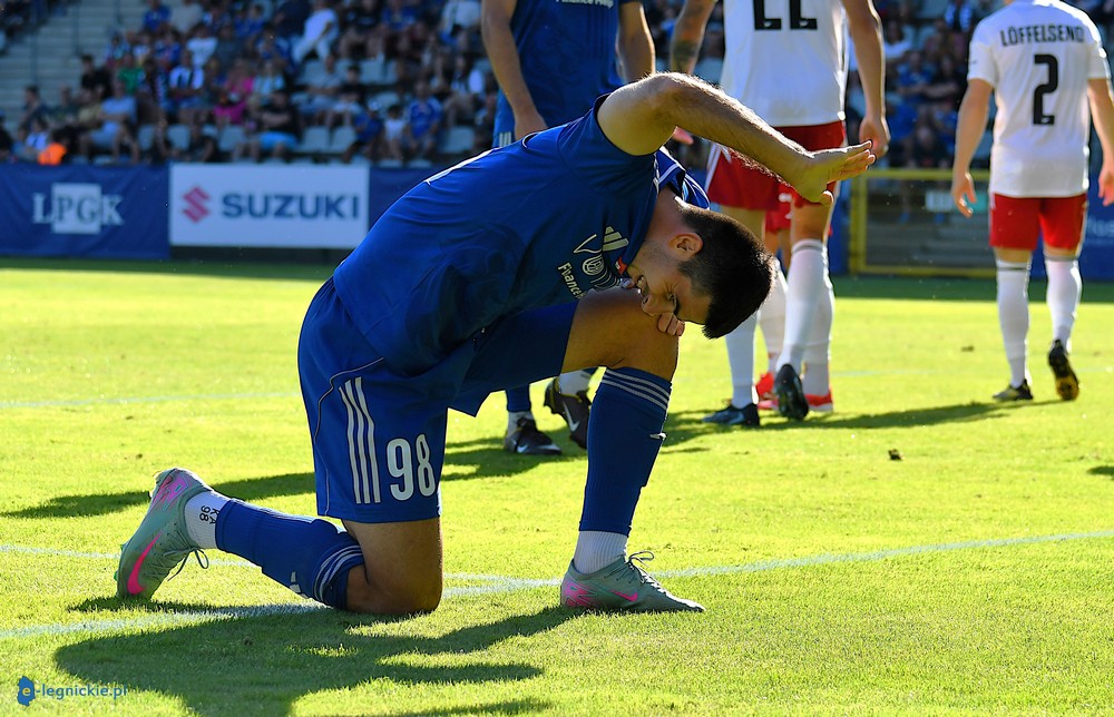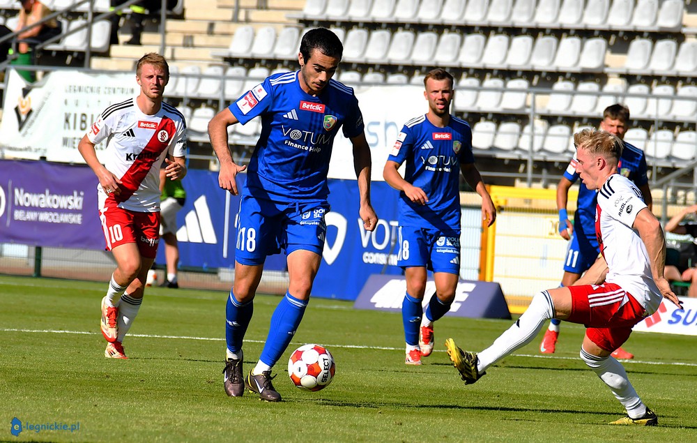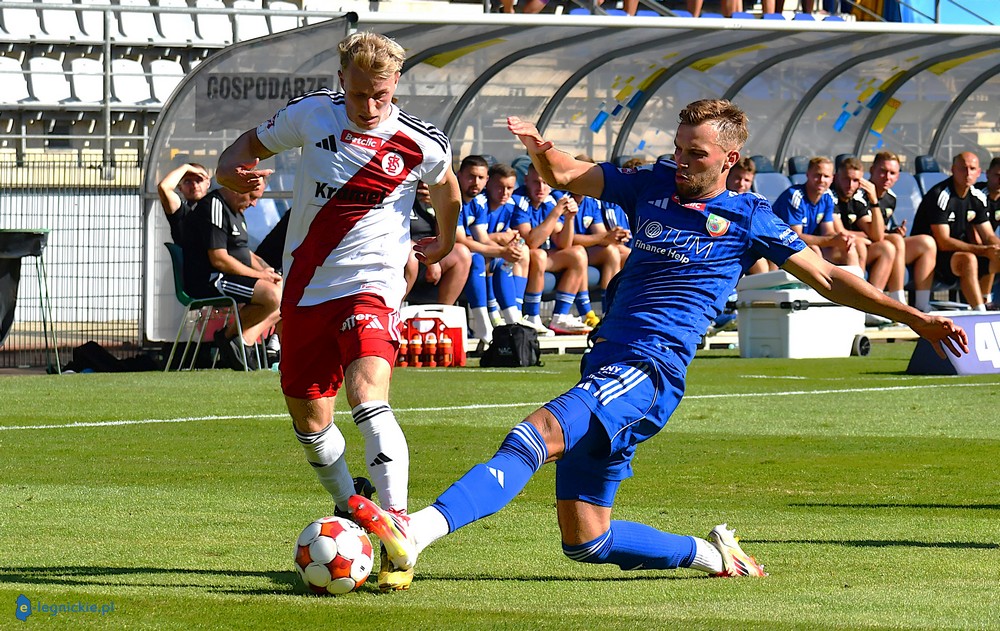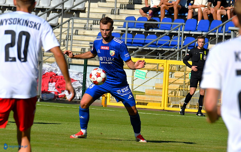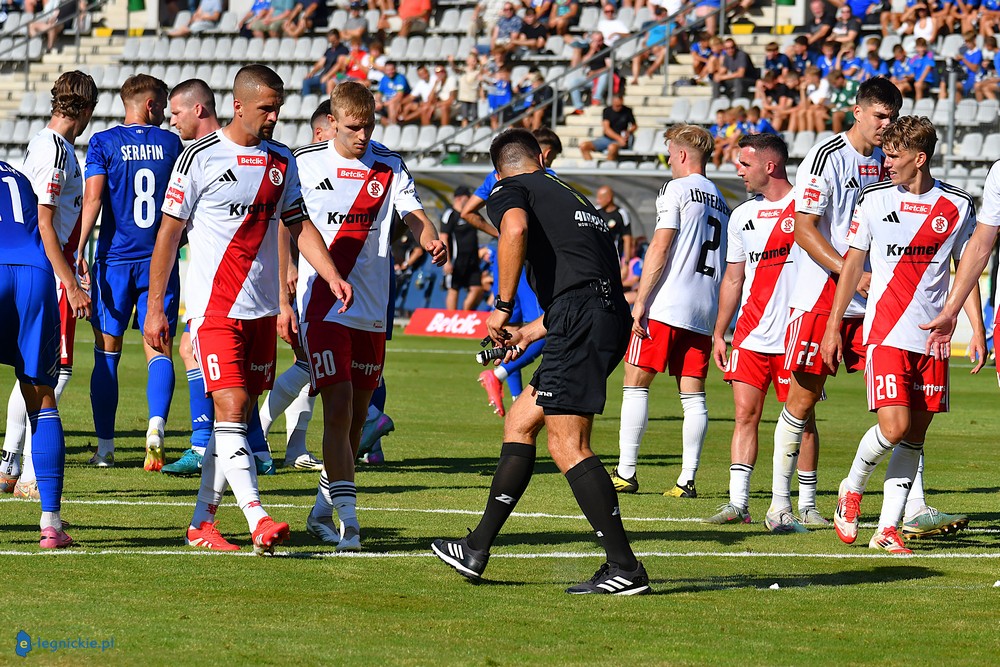 Legniczanie mogli strzelić trzeciego gola, ale po uderzeniu z rzutu wolnego Jakuba Serafina piłka trafiła w poprzeczkę.