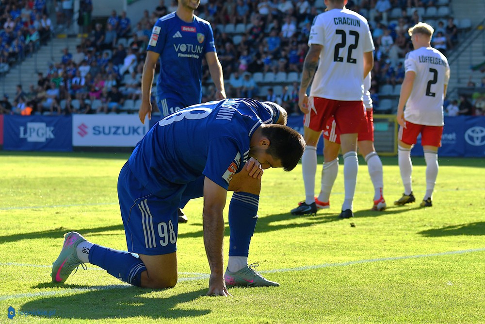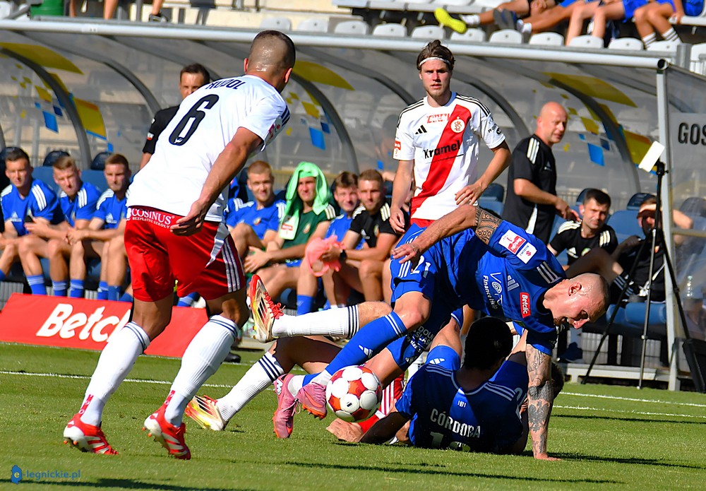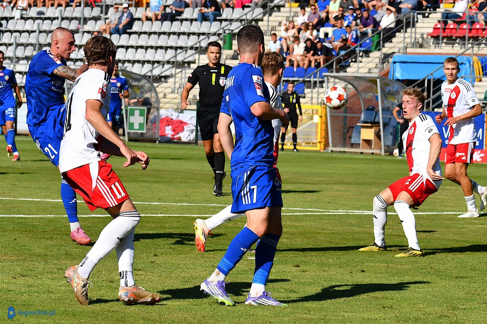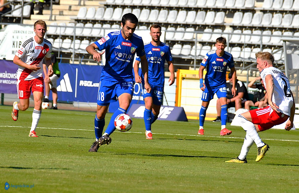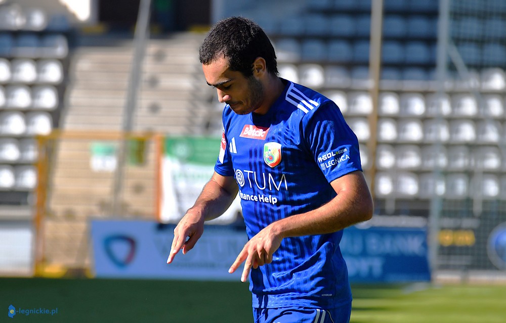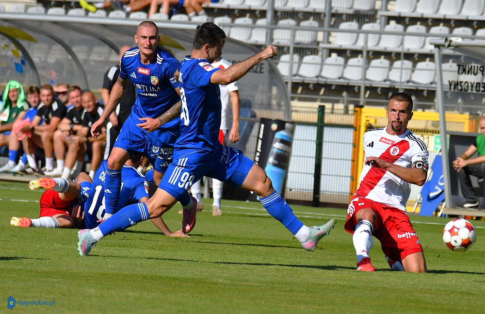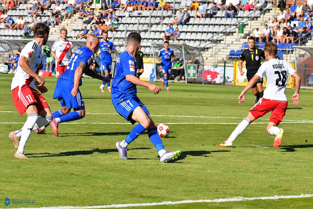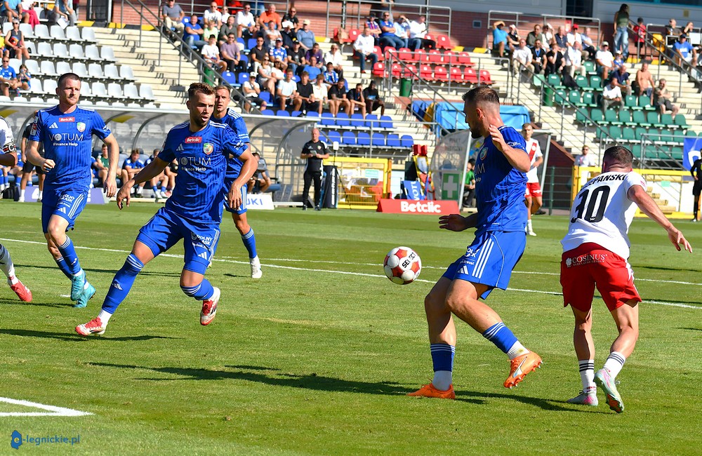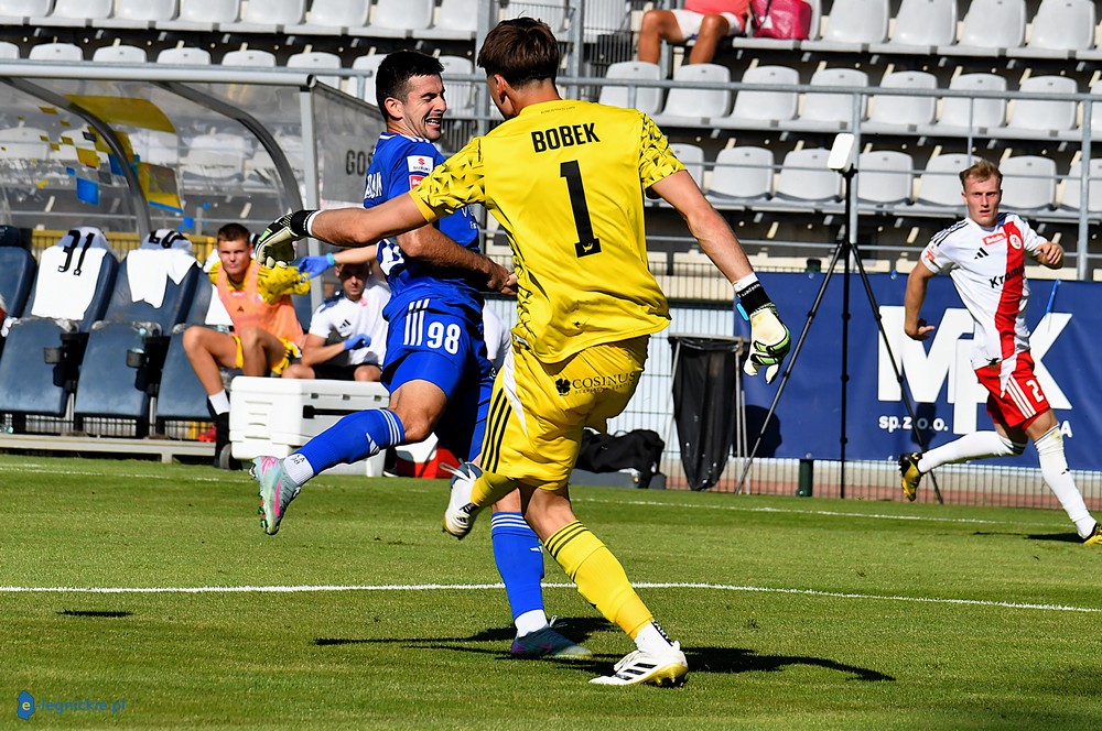 Legniczanie mogli strzelić trzeciego gola, ale po uderzeniu z rzutu wolnego Jakuba Serafina piłka trafiła w poprzeczkę.