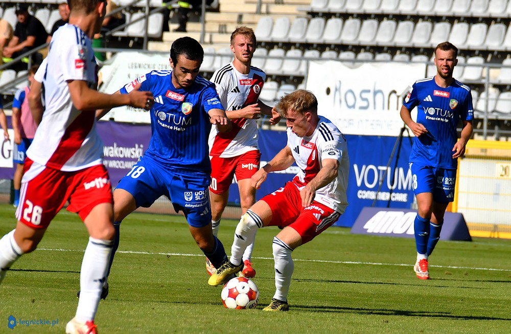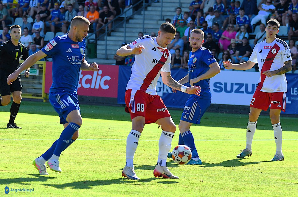 Mecz rozpoczął się świetnie dla legniczan, bo już w 5. minucie kibice mieli okazję cieszyć się z gola. Po strzale Kamila Antonika z prawej strony boiska, piłka odbiła się od Sebastiana Rudola i wpadła do siatki.