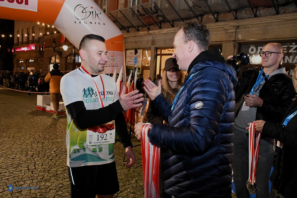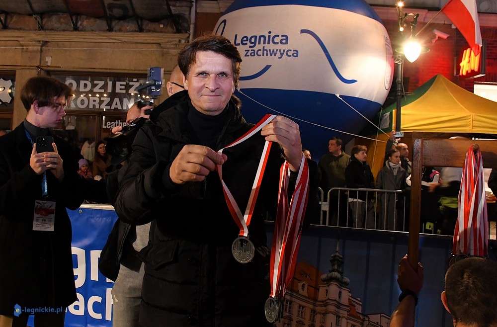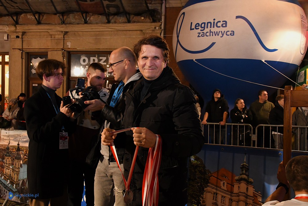 Na mecie medale biegaczom wręczali prezydenci: Maciej KUPAJ i Jacek BASZCZYK w towarzystwie Karoliny JACZEWSKIEJ-SZYMKOWIAK, przewodniczącej Rady Miejskiej. Z prezydentem Legnicy Maciejem Kupajem chętnie pozowała do zdjęć najstarsza uczestniczka biegu - Nina ZACZYŃSKA z Lubina.