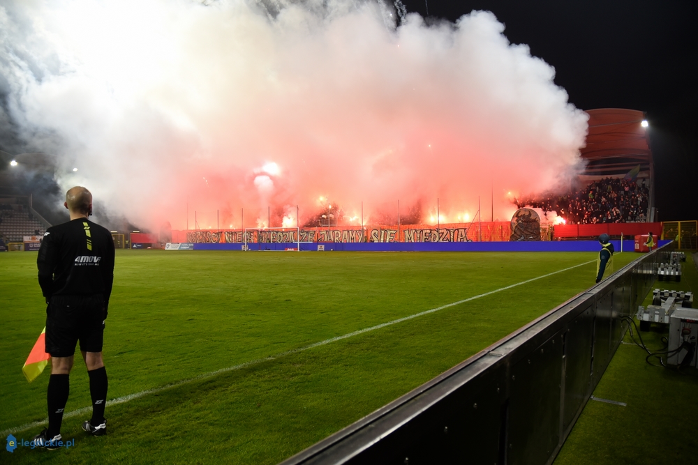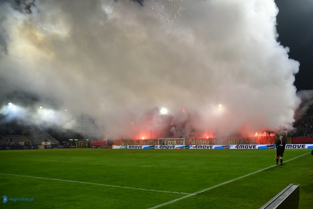 W pierwszej połowie fani Miedzi zaprezentowali pokaz pirotechniki zadymiając boisko. Przerwa trwała 8 minut, a na murawę spadło trochę pozostałości po racach. Już wszyscy wiedzą, że kibice z sektora C "jarają się Miedzią". Ale za "jaranie się" kary zapłaci niestety klub i oby nie skończyło się karą zamknięcia trybuny C...
