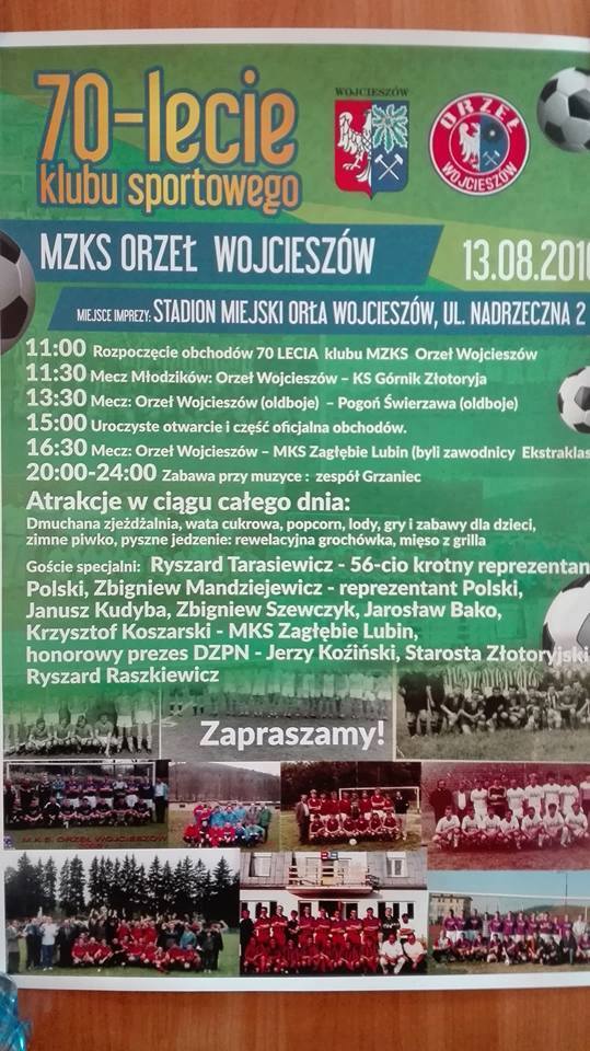 WOJCIESZÓW. 70-lecie obchodzi klub Orzeł Wojcieszów w powiecie złotoryjskim i z tej okazji sobota na stadionie miejskim upłynie pod znakiem futbolu. Głównym wydarzeniem obchodów będzie mecz piłkarskich gwiazd. Swój udział potwierdzili m.in.Krzysztof Koszarski, Jarosław Bako, Ryszard Tarasiewicz i inni. - Imprezy piłkarskie na stadionie miejskim rozpoczną się już od godziny 11 i będą to mecze drużyn młodzieżowych - zaprasza Zbigniew Rzeczkowski, prezes Orła.