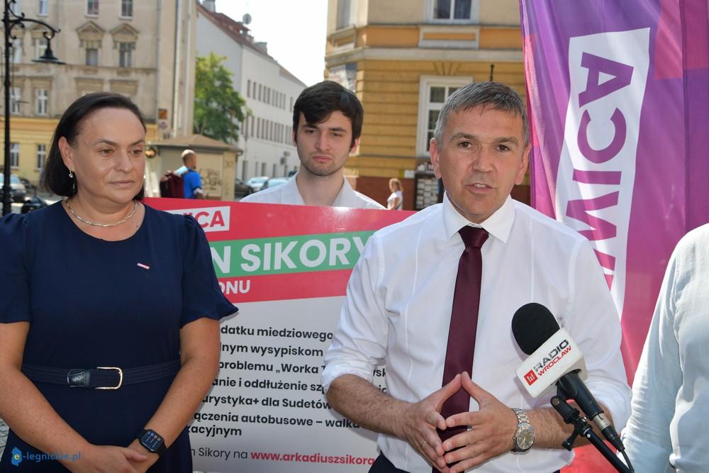 LEGNICA. W samo południe w centrum Legnicy Arkadiusz SIKORA, lider dolnośląskiej Lewicy, nr 1 na liście Komitetu Wyborczego Nowa Lewica w okręgu legnicko-jeleniogórskim ogłosił "Plan Sikory dla Zagłębia Miedziowego. Sikorze towarzyszyła Agnieszka BEM - także kandydatka do Sejmu z listy Nowej Lewicy oraz samorządowcy z powiatu lwóweckiego , zgorzeleckiego: starosta powiatu lwóweckiego Daniel Koko, wicestarosta powiatu zgorzeleckiego Mirosław Fiedorowicz, a także Michał Huzarski, szef struktur Lewicy w powiecie legnickim. - Ogłosiliśmy mój plan dla regionu. Plan Sikory , który powstał on w ramach konsultacji z samorządowcami oraz mieszkańcami regionu - mówi Arkadiusz SIKORA. - To zbiór bardzo ważnych punktów programowych, które zamierzam zrealizować po uzyskaniu mandatu posła. Sprawy zachodniej części Dolnego Śląska, które wezmę na tapet, to przede wszystkim tematyka transformacji społeczno-gospodarczej oraz energetycznej "Worka Turoszowskiego" oraz likwidacja podatku od kopalin, czyli tzw. "podatku miedziowego". Dodatkowo zamierzam stworzyć Dolnośląski Klaster Śmieciowy, który monitorować będzie transfer odpadów niebezpiecznych.