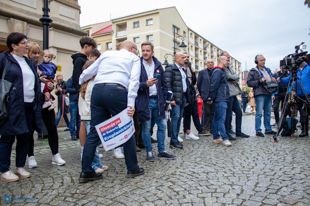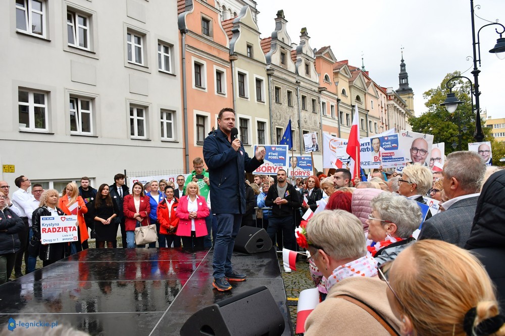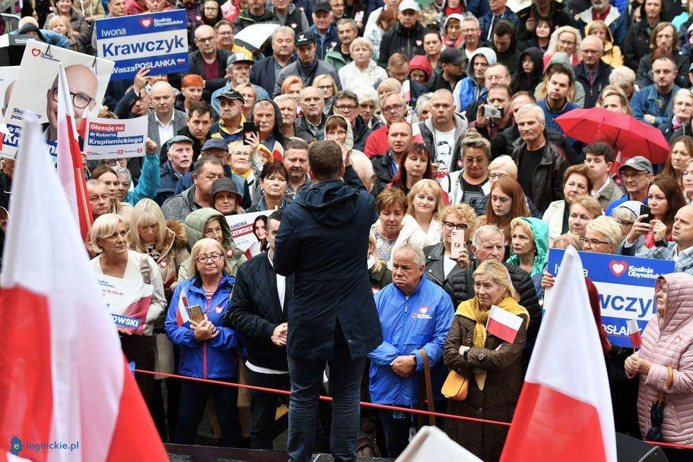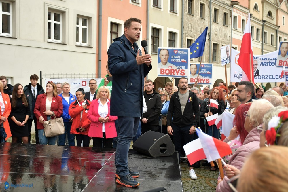 LEGNICA. Przy utworze „Jeszcze będzie pięknie” na scenę na legnickim rynku wszedł Rafał Trzaskowski - jeden z liderów Platformy Obywatelskiej. Prezydent Warszawy przyjechał do Legnicy by zmobilizować zwolenników opozycji do udziału w wyborach i zagłosowania na Koalicję Obywatelską. Na otwarte spotkanie z politykiem przyszło kilkaset osób.