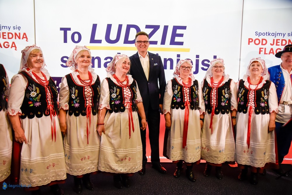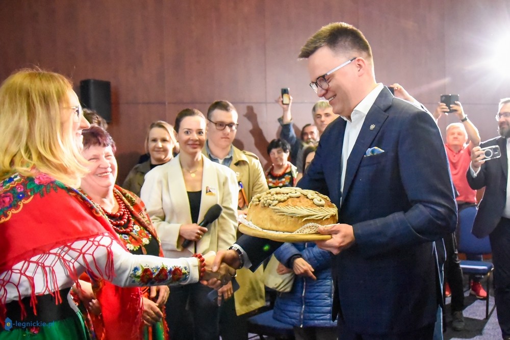 LEGNICA. Blisko 200 osób pojawiło się na spotkaniu z Marszałkiem Sejmu Szymonem HOŁOWNIĄ, kandydatem na Prezydenta RP. Wchodzącego na salę Szymona Hołownię przywitał zespół folklorystyczny Marzenie z terenu Powiatu Polkowickiego. Na spotkaniu nie zabrakło czołowych polityków Trzeciej Drogi i samorządowców . Byli posłowie: Tadeuesz SAMBORSKI, Aleksandra LEO, wiceprzewodnicząca Klubu Parlamentarnego Trzeciej Drogi, Piotr Gramatyka i inni. Samorządowców godnie reprezentowali: Kamil CIUPAK, starosta polkowicki, wicestarosta Jan WÓJTOWICZ, który jednocześnie był jednym z organizatorów tego owocnego spotkania, Stanisław LASKOWSKI, z Powiatu Jaworskiego, Janina MAZUR wicestarosta Powiatu Legnickiego, Krzysztof SOWIŃSKI, członek zarządu Powiatu Legnickiego i kilku radnych z terenu Jawora i powiatu legnickiego.