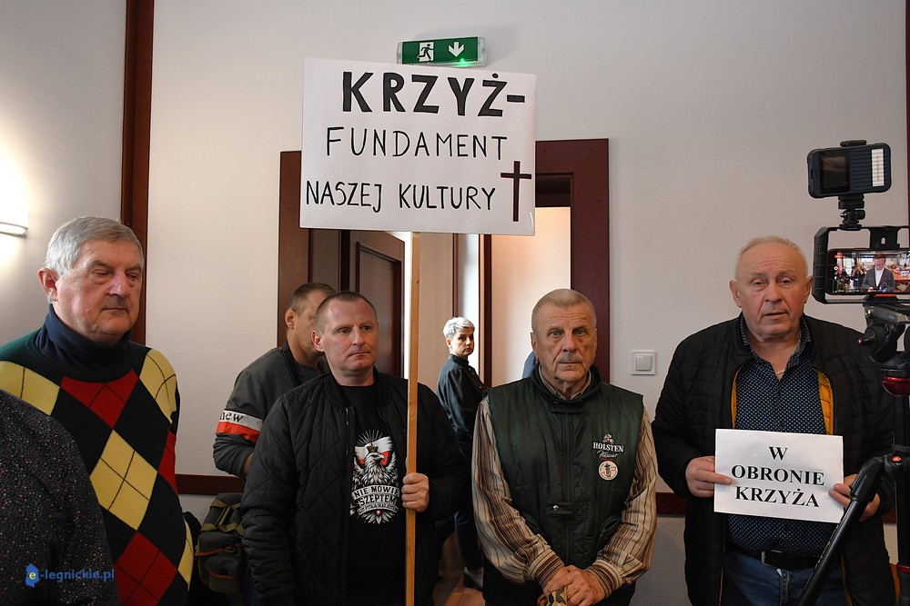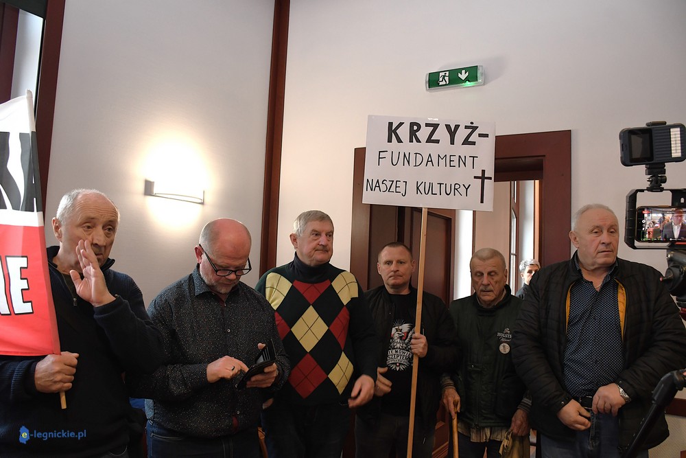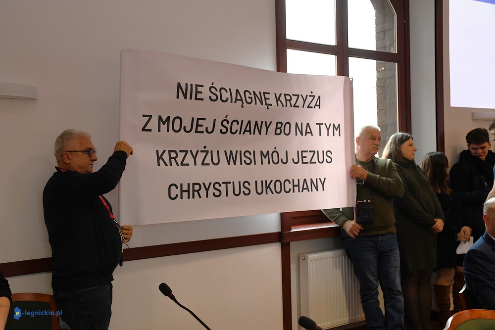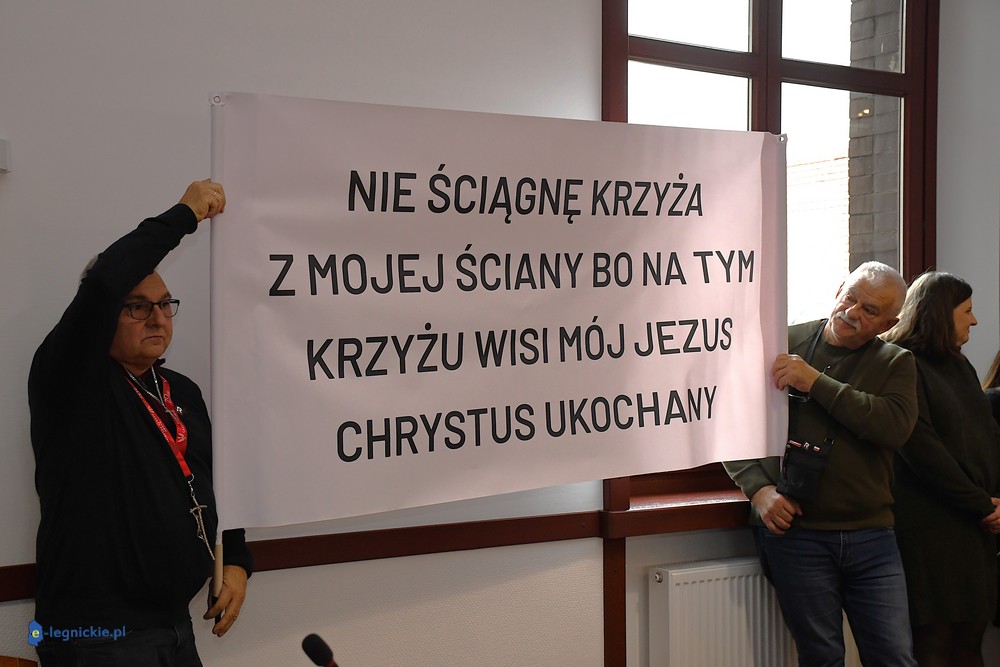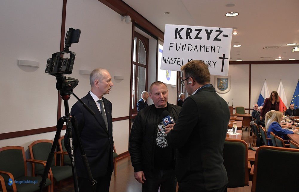 Na sesji radny Adam Wierzbicki (PiS) przyszedł z ogromnym krucyfiksem i ustawił go na stole prezydialnym. Zapowiedział, że będzie go przynosił na każdą sesję, co obrońcy krzyża powitali oklaskami. - To nasz protest przeciwko arbitralnej decyzji prezydenta Macieja Kupaja, który usunął z sali obrad krzyż powieszony tam przed ponad 20 laty.