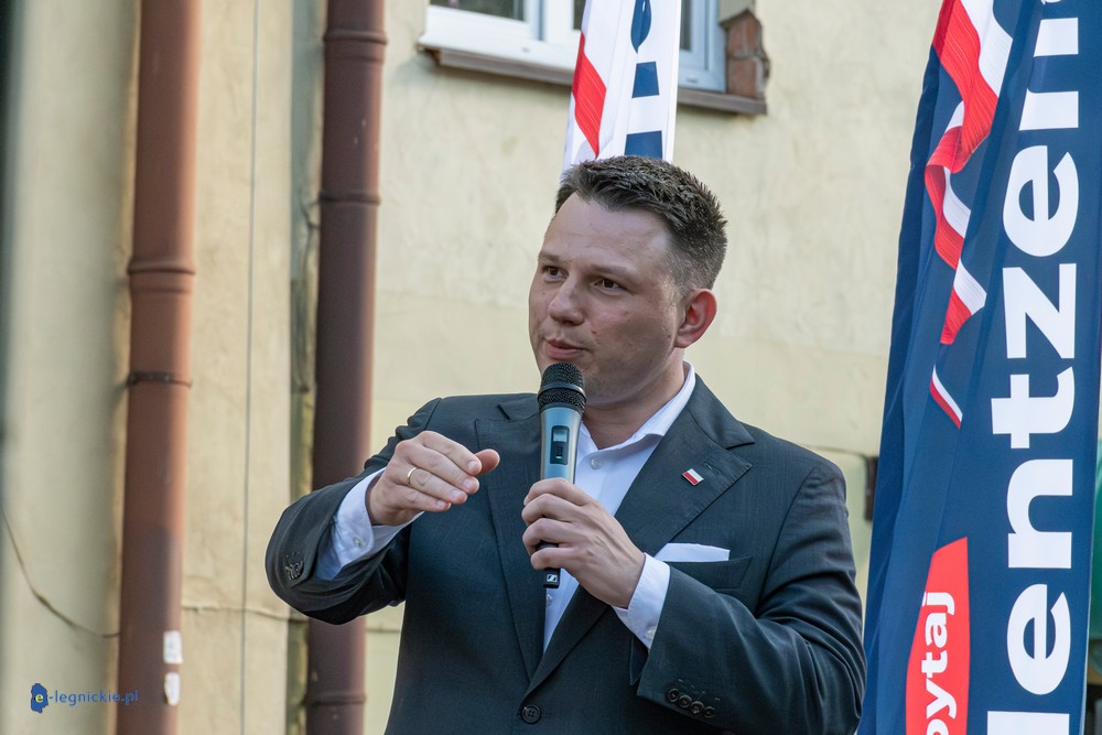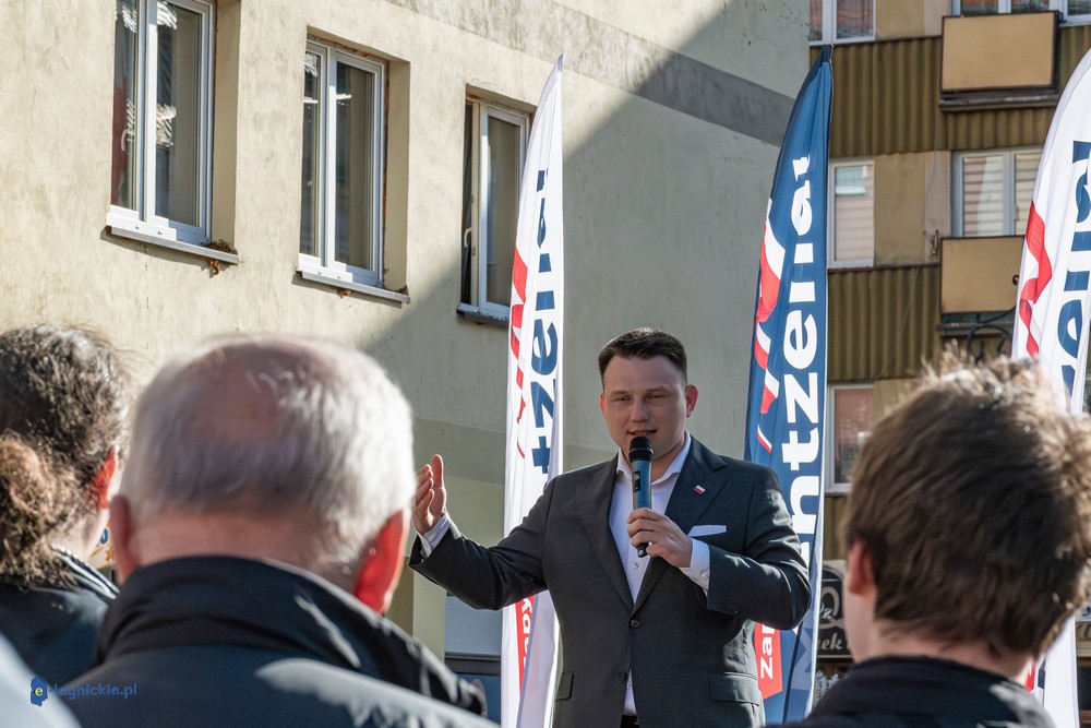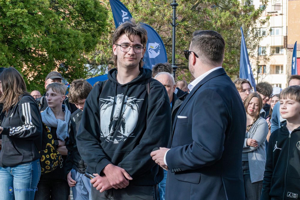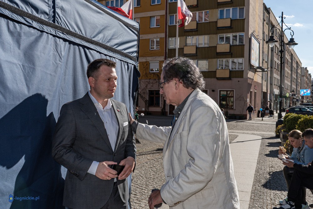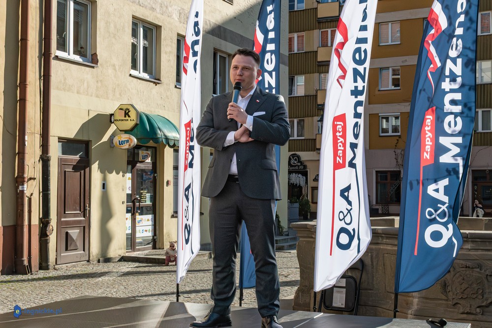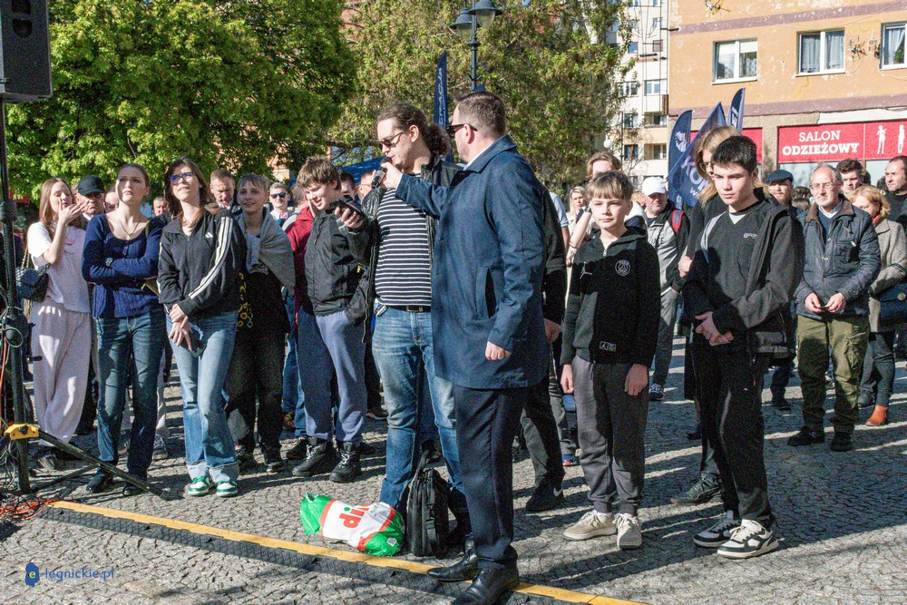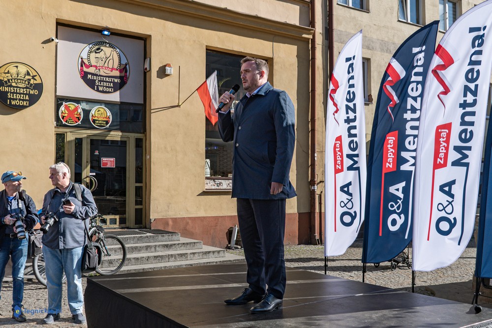 LEGNICA. Około 150 osób przyszło w środowe popołudnie na Rynek, by spotkać się z Sławomirem Mentzenem, liderem partii "Nowa Nadzieja". Otwarte spotkanie w formule Q&A rozpoczęło się o godz. 17:00 i od początku było dynamiczne – pytania sypały się jedno po drugim. Organizatorzy zadbali też o uczestników – przed wydarzeniem i w jego trakcie serwowano gorącą grochówkę.