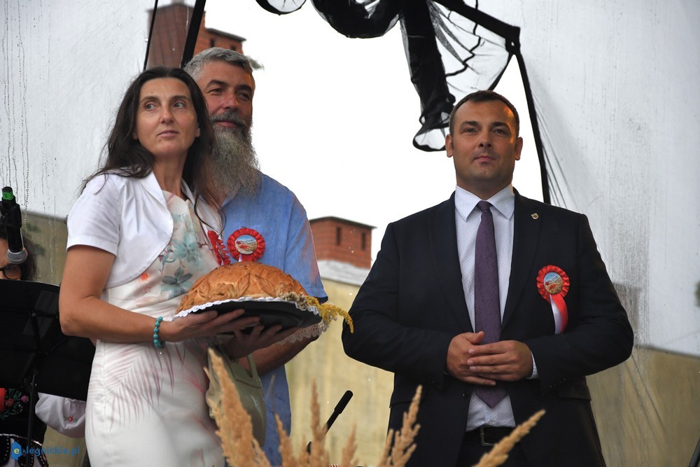 Zgodnie ze zwyczajem starostowie dożynek przekazali chleb wypiekany z mąki przygotowanej ze zbóż zebranych w czasie tegorocznych zbiorów burmistrzowi Ścinawy Krystianowi KOSZTYLE.