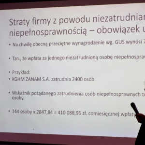 Z kolei Wojciech Szanduła - Kierownik Powiatowe Centrum Pomocy Rodzinie w Złotoryi omówił zalety zatrudniania osób niepełnosprawnych opierając się m.in. o KGHM ZANAM, spółkę mogącą być przykładem tego rodzaju prospołęcznyych praktyk.