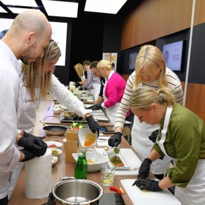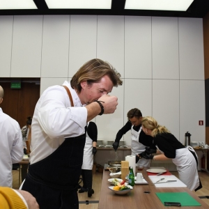 Mistrz Okrasa podczas warsztatów zaprezentował - mistrzowskie przyrządzenie - najpierw strudla z łososiem i kapusta kiszoną w cieście francuskim, a jako drugą potrawę strogonowa na bazie piersi z kurczaka. Potem pod okiem samego Mistrza trzydziestu laureatów konkursu, pracowników KGHM, te same potrawy przyrządzali sami uczestnicy warsztatów , którzy pracowali podzieleni na trzyosobowe grupy.