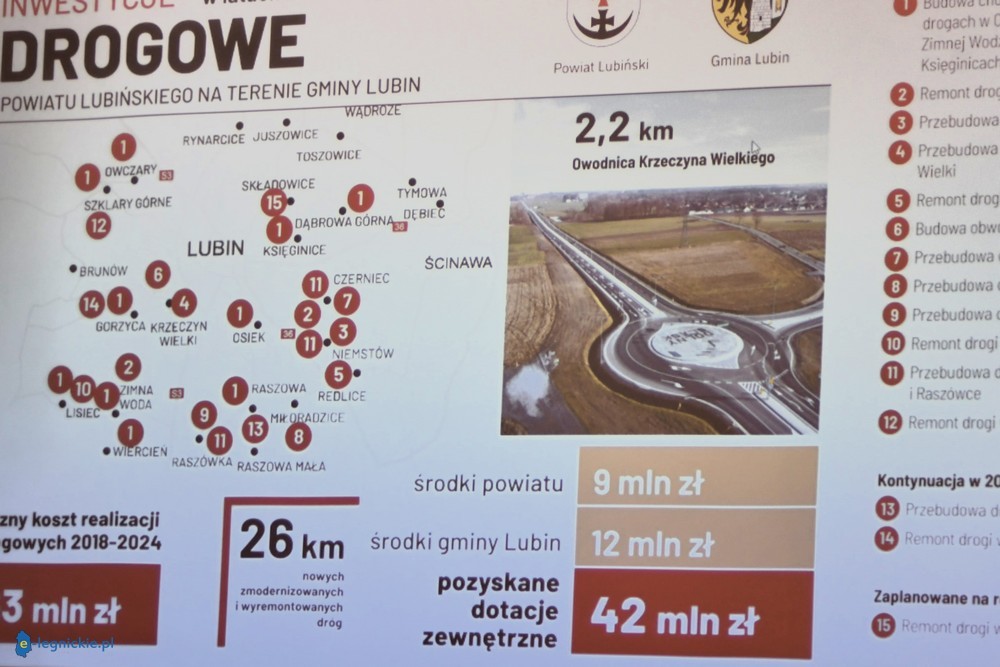 Dodajmy, ze sieć dróg powiatowych to 230 km z czego 96 km przebiega w granicach gminy Lubin.