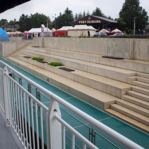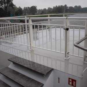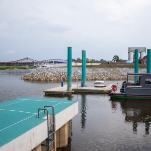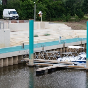 Zdecydowano się na pływające pomosty z uwagi na różne stany rzeki. W utrzymujących się na wodzie konstrukcjach wykonano kanały techniczne, którymi będą biegły m.in. sieci: kanalizacyjna oraz elektryczna. Podobne pomosty zostały już wykonane w ramach nowej przystani w Dziewinie.