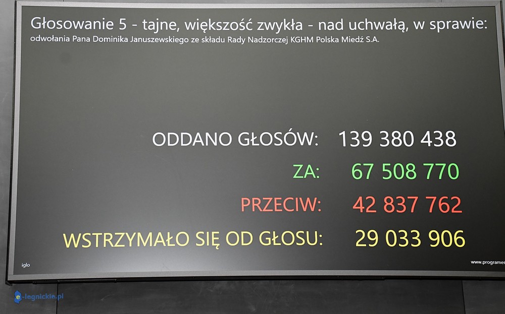 LUBIN. Podczas dzisiejszego Nadzwyczajnego Walnego Zgromadzenia Akcjonariuszy, odwołano czterech urzędujących członków Rady a w ich miejsce powołano nowych, desygnowanych przez Ministerstwo Aktywów Państwowych. Odwołani zostali: Aleksander Cieśliński, Tadeusz Kocowski, Zbysław Dobrowolski oraz Dominik Januszewski. Ich miejsce zajęli: Zbigniew Ćwiąkalski – były minister sprawiedliwości, Remigiusz Paszkiewicz, Artur Ulrich oraz Łukasz Żelewski. Skład RN KGHM nadal liczy 10 członków.