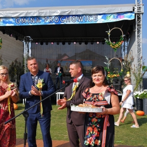 PROCHOWICE. Po kilkudziesięciominutowym marszu barwny korowód dotarł na miejski stadion. Na stadionie przed sceną ustawiono 14 sołeckich arcydzieł czyli przepiękne, bajecznie wykonane wieńce dożynkowe. Rozpoczęło się misterium chleba i starostowie Gminnych Dożynek 2024: Elżbieta KOŁODZIEJ i Paweł PISKOROWSKI ( oboje z Dąbia) przekazali gospodarzom uroczystości: burmistrz Alicji Sielickiej i przewodniczącemu Rady Miasta i Gminy Sebastianowi Siwoniowi dorodny bochen chleba.