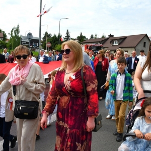 PROCHOWICE. Uroczystości związane z 234. rocznicą uchwalenia Konstytucji 3 Maja rozpoczęły się od Mszy Św. w intencji Ojczyzny w kościele pw. św. Jana Chrzciciela w Prochowicach. Na zakończenie mszy nastąpiło przekazanie złożonej flagi państwowej burmistrz Alicji SIELICKIEJ przez honorową asystę żołnierzy 16. Dolnośląskiej Brygady Obrony Terytorialnej. Ta flaga miała zostać później wciągnięta na maszt ustawiony na prochowickim Rynku. Po uroczystym nabożeństwie przez miasteczko w kierunku Rynku przeszedł biało-czerwony korowód. Na czele korowodu szła burmistrz Alicja SIELICKA wraz z posłem Tadeuszem SAMBORSKIM i Przewodniczącym Rady Gminy Sebastianem SIWONIEM. Za nimi kroczyli mieszkańcy Prochowic wraz z radnymi, przedstawicielami jednostek samorządowych, harcerzy którzy nieśli długą na 100 metrów flagę biało-czerwoną.