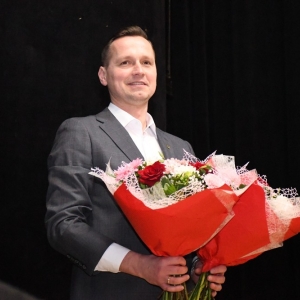 Burmistrz Robert Pawłowski i jego zastępca Paweł Kulig pięknymi bukietami kwiatów osoby związane z Echem Złotoryi.