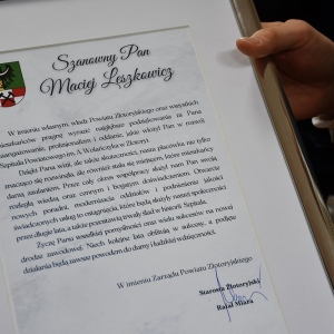 POWIAT ZŁOTORYJSKI. W sali konferencyjnej Starostwa Powiatu Złotoryjskiego odbyła się VIII Sesja Rady Powiatu Złotoryjskiego. Jednym z omawianych punktów była informacja z bieżącej działalności Spółki Szpital Powiatowy w Złotoryi, podczas którego Starosta Złotoryjski Rafał MIARA, Wicestarosta Beata GRALAK oraz Radni Powiatu Złotoryjskiego podziękowali Prezesowi zarządu Szpitala im. A.Wolańczyka Maciejowi LESZKOWICZOWI za współpracę i życzyli powodzenia w dalszej drodze zawodowej. Były kwiaty i łzy wzruszenia. - Niewielu było takich, którzy wierzyli w Ciebie i w to, że dasz radę wyprowadzić szpitala powiatowy na prostą. Miałeś wsparcie zarządu Powiatu Złotoryjskiego, moje osobiste, ale o sukcesie zadecydowało Twoje wielkie serce do tego co robisz. Mam nadzieję, że nowe wyzwanie, którego się podjąłeś - mam na myśli szpital w Legnicy - także zakończy się wielkim sukcesem - mówi starosta Rafał MIARA. - I wierzę, że po pierwsze nigdy o nas nie zapomnisz już jak dyrektor Wojewódzkiego Szpitala Specjalistycznego w Legnicy, a po drugie, wierzę, że w wyniku konkursu znajdziemy godnego ciebie następcę.